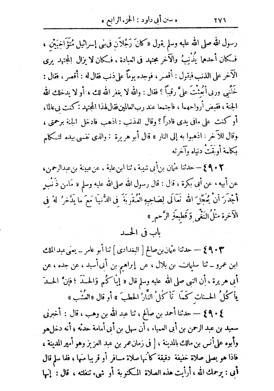 4904 - حَدَّثَنَا أَحْمَدُ بْنُ صَالِحٍ، حَدَّثَنَا عَبْدُ اللَّهِ بْنُ وَهْبٍ، قَالَ: أَخْبَرَنِي سَعِيدُ بْنُ عَبْدِ الرَّحْمَنِ بْنِ أَبِي الْعَمْيَاءِ، أَنَّ سَهْلَ بْنَ أَبِي أُمَامَةَ، حَدَّثَهُ، أَنَّهُ دَخَلَ هُوَ وَأَبُوهُ عَلَى أَنَسِ بْنِ مَالِكٍ بِالْمَدِينَةِ فِي زَمَانِ عُمَرَ بْنِ عَبْدِ الْعَزِيزِ وَهُوَ أَمِيرُ الْمَدِينَةِ، فَإِذَا هُوَ يُصَلِّي صَلَاةً خَفِيفَةً دَقِيقَةً كَأَنَّهَا صَلَاةُ مُسَافِرٍ أَوْ قَرِيبًا مِنْهَا، فَلَمَّا سَلَّمَ قَالَ أَبِي: يَرْحَمُكَ اللَّهُ، أَرَأَيْتَ هَذِهِ الصَّلَاةَ الْمَكْتُوبَةَ أَوْ شَيْءٌ تَنَفَّلْتَهُ، قَالَ: إِنَّهَا -[277]- الْمَكْتُوبَةُ، وَإِنَّهَا لَصَلَاةُ رَسُولِ اللَّهِ صَلَّى اللهُ عَلَيْهِ وَسَلَّمَ مَا أَخْطَأْتُ إِلَّا شَيْئًا سَهَوْتُ عَنْهُ، فَقَالَ: إِنَّ رَسُولَ اللَّهِ صَلَّى اللهُ عَلَيْهِ وَسَلَّمَ كَانَ يَقُولُ: " §لَا تُشَدِّدُوا عَلَى أَنْفُسِكُمْ فَيُشَدَّدَ عَلَيْكُمْ، فَإِنَّ قَوْمًا شَدَّدُوا عَلَى أَنْفُسِهِمْ فَشَدَّدَ اللَّهُ عَلَيْهِمْ، فَتِلْكَ بَقَايَاهُمْ فِي الصَّوَامِعِ وَالدِّيَارِ {وَرَهْبَانِيَّةً ابْتَدَعُوهَا مَا كَتَبْنَاهَا عَلَيْهِمْ} [الحديد: 27] " ثُمَّ غَدَا مِنَ الْغَدِ فَقَالَ: «أَلَا تَرْكَبُ لِتَنْظُرَ وَلِتَعْتَبِرَ؟» قَالَ: نَعَمْ، فَرَكِبُوا جَمِيعًا فَإِذَا هُمْ بِدِيَارٍ بَادَ أَهْلُهَا وَانْقَضَوْا وَفَنُوا خَاوِيَةٍ عَلَى عُرُوشِهَا، فَقَالَ: «أَتَعْرِفُ هَذِهِ الدِّيَارَ؟» فَقُلْتُ: مَا أَعْرَفَنِي بِهَا وَبِأَهْلِهَا، «هَذِهِ دِيَارُ قَوْمٍ أَهْلَكَهُمُ الْبَغْيُ وَالْحَسَدُ، إِنَّ الْحَسَدَ يُطْفِئُ نُورَ الْحَسَنَاتِ، وَالْبَغْيُ يُصَدِّقُ ذَلِكَ أَوْ يُكَذِّبُهُ، وَالْعَيْنُ تَزْنِي، وَالْكَفُّ، وَالْقَدَمُ، وَالْجَسَدُ، وَاللِّسَانُ، وَالْفَرْجُ يُصَدِّقُ ذَلِكَ أَوْ يُكَذِّبُهُ»