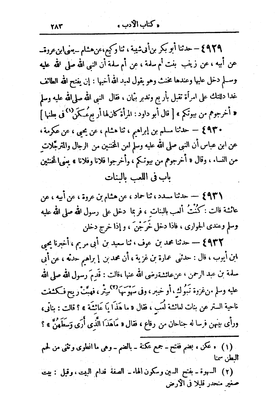 4929 - حَدَّثَنَا أَبُو بَكْرِ بْنُ أَبِي شَيْبَةَ، حَدَّثَنَا وَكِيعٌ، عَنْ هِشَامٍ يَعْنِي ابْنَ عُرْوَةَ، عَنْ أَبِيهِ، عَنْ زَيْنَبَ بِنْتِ أُمِّ سَلَمَةَ، عَنْ أُمِّ سَلَمَةَ، أَنَّ النَّبِيَّ صَلَّى اللهُ عَلَيْهِ وَسَلَّمَ دَخَلَ عَلَيْهَا وَعِنْدَهَا مُخَنَّثٌ وَهُوَ يَقُولُ لِعَبْدِ اللَّهِ أَخِيهَا: إِنْ يَفْتَحِ اللَّهُ الطَّائِفَ غَدًا دَلَلْتُكَ عَلَى امْرَأَةٍ تُقْبِلُ بِأَرْبَعٍ، وَتُدْبِرُ بِثَمَانٍ، فَقَالَ النَّبِيُّ صَلَّى اللهُ عَلَيْهِ وَسَلَّمَ: «§أَخْرِجُوهُمْ مِنْ بُيُوتِكُمْ» قَالَ أَبُو دَاوُدَ: «الْمَرْأَةُ كَانَ لَهَا أَرْبَعُ عُكَنٍ فِي بَطْنِهَا»