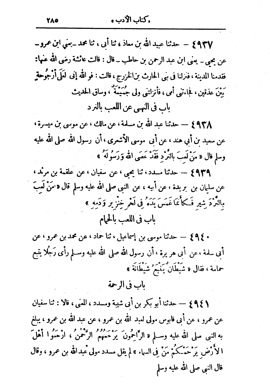 4939 - حَدَّثَنَا مُسَدَّدٌ، حَدَّثَنَا يَحْيَى، عَنْ سُفْيَانَ، عَنْ عَلْقَمَةَ بْنِ مَرْثَدٍ، عَنْ سُلَيْمَانَ بْنِ بُرَيْدَةَ، عَنْ أَبِيهِ، عَنِ النَّبِيِّ صَلَّى اللهُ عَلَيْهِ وَسَلَّمَ، قَالَ: «§مَنْ لَعِبَ بِالنَّرْدَشِيرِ فَكَأَنَّمَا غَمَسَ يَدَهُ فِي لَحْمِ خِنْزِيرٍ وَدَمِهِ»