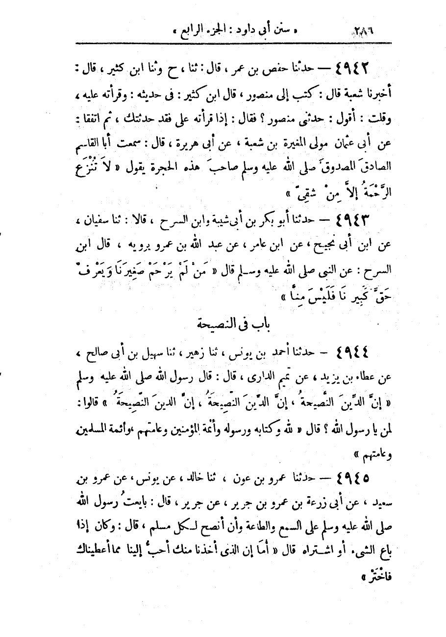 4944 - حَدَّثَنَا أَحْمَدُ بْنُ يُونُسَ، حَدَّثَنَا زُهَيْرٌ، حَدَّثَنَا سُهَيْلُ بْنُ أَبِي صَالِحٍ، عَنْ عَطَاءِ بْنِ يَزِيدَ، عَنْ تَمِيمٍ الدَّارِيِّ، قَالَ: قَالَ رَسُولُ اللَّهِ صَلَّى اللهُ عَلَيْهِ وَسَلَّمَ: «إِنَّ §الدِّينَ النَّصِيحَةُ إِنَّ الدِّينَ النَّصِيحَةُ إِنَّ الدِّينَ النَّصِيحَةُ» قَالُوا: لِمَنْ يَا رَسُولَ اللَّهِ قَالَ: «لِلَّهِ وَكِتَابِهِ وَرَسُولِهِ، وَأَئِمَّةِ الْمُؤْمِنِينَ، وَعَامَّتِهِمْ، أَوْ أَئِمَّةِ الْمُسْلِمِينَ، وَعَامَّتِهِمْ»
