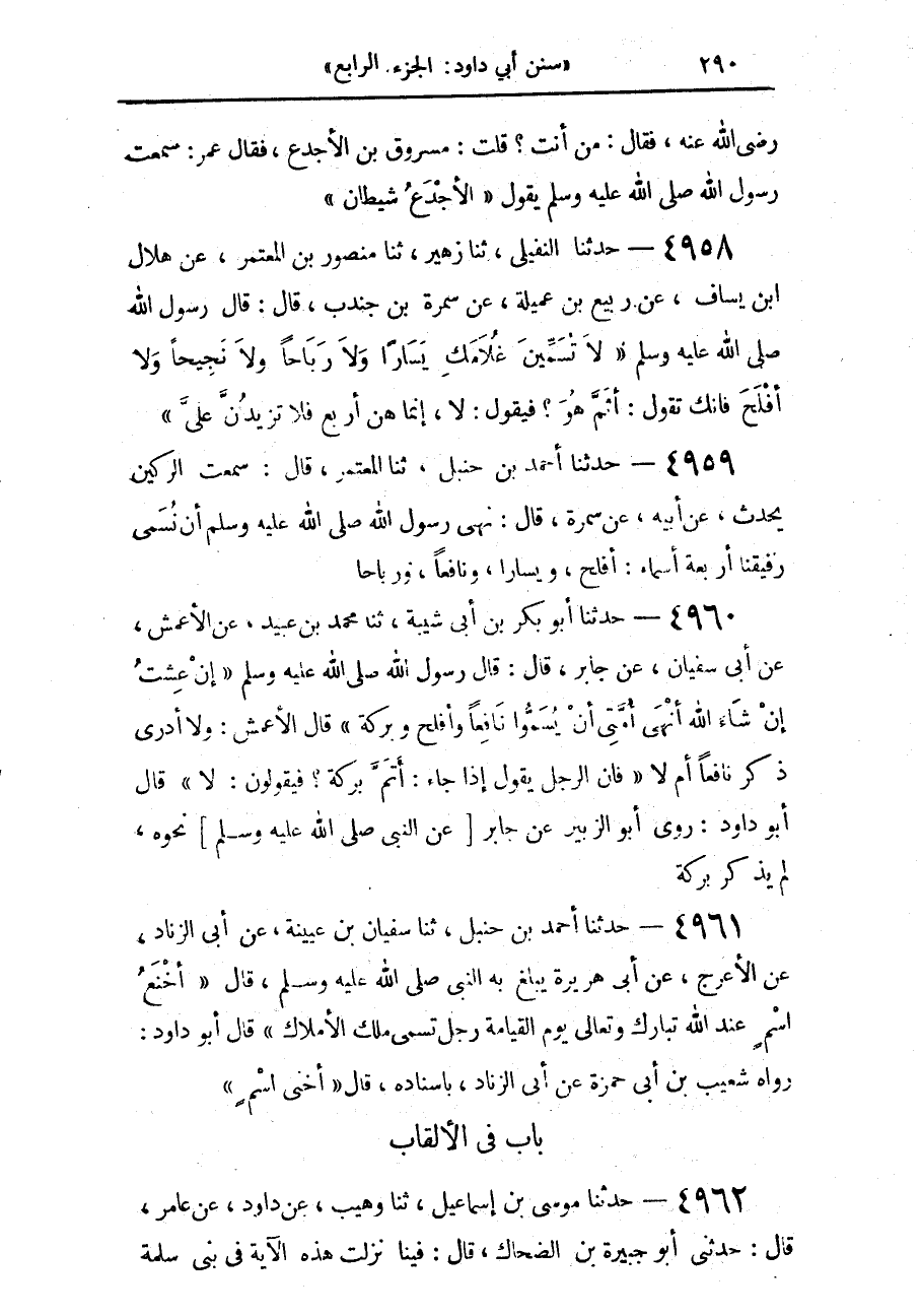 4958 - حَدَّثَنَا النُّفَيْلِيُّ، حَدَّثَنَا زُهَيْرٌ، حَدَّثَنَا مَنْصُورُ بْنُ الْمُعْتَمِرِ، عَنْ هِلَالِ بْنِ يَسَافٍ، عَنْ رَبِيعِ بْنِ عُمَيْلَةَ، عَنْ سَمُرَةَ بْنِ جُنْدُبٍ، قَالَ: قَالَ رَسُولُ اللَّهِ صَلَّى اللهُ عَلَيْهِ وَسَلَّمَ: «§لَا تُسَمِّيَنَّ غُلَامَكَ يَسَارًا، وَلَا رَبَاحًا، وَلَا نَجِيحًا، وَلَا أَفْلَحَ»، فَإِنَّكَ تَقُولُ: أَثَمَّ هُوَ؟ فَيَقُولُ: «لَا إِنَّمَا هُنَّ أَرْبَعٌ فَلَا تَزِيدَنَّ عَلَيَّ»
