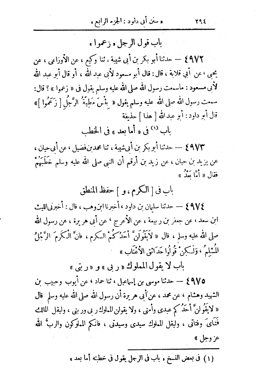 4972 - حَدَّثَنَا أَبُو بَكْرِ بْنُ أَبِي شَيْبَةَ، حَدَّثَنَا وَكِيعٌ، عَنِ الْأَوْزَاعِيِّ، عَنْ يَحْيَى، عَنْ أَبِي قِلَابَةَ، قَالَ: قَالَ أَبُو مَسْعُودٍ لِأَبِي عَبْدِ اللَّهِ أَوْ قَالَ: أَبُو عَبْدِ اللَّهِ لِأَبِي مَسْعُودٍ مَا سَمِعْتَ رَسُولَ اللَّهِ صَلَّى اللهُ عَلَيْهِ وَسَلَّمَ يَقُولُ: فِي «زَعَمُوا؟» قَالَ: سَمِعْتُ رَسُولَ اللَّهِ صَلَّى اللهُ عَلَيْهِ وَسَلَّمَ يَقُولُ: «§بِئْسَ مَطِيَّةُ الرَّجُلِ زَعَمُوا» قَالَ أَبُو دَاوُدَ: " أَبُو عَبْدِ اللَّهِ هَذَا: حُذَيْفَةُ "