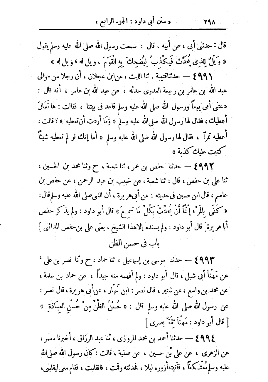 4993 - حَدَّثَنَا مُوسَى بْنُ إِسْمَاعِيلَ، حَدَّثَنَا حَمَّادٌ، ح وحَدَّثَنَا نَصْرُ بْنُ عَلِيٍّ، عَنْ مُهَنَّا أَبِي شِبْلٍ، قَالَ أَبُو دَاوُدَ: «وَلَمْ أَفْهَمْهُ مِنْهُ جَيِّدًا» عَنْ حَمَّادِ بْنِ سَلَمَةَ، عَنْ مُحَمَّدِ بْنِ وَاسِعٍ، عَنْ شُتَيْرٍ، قَالَ: نَصْرٌ ابْنُ نَهَّارٍ عَنْ أَبِي هُرَيْرَةَ، - قَالَ نَصْرٌ - عَنْ رَسُولِ اللَّهِ صَلَّى اللهُ عَلَيْهِ وَسَلَّمَ، قَالَ: «§حُسْنُ الظَّنِّ مِنْ حُسْنِ الْعِبَادَةِ» قَالَ أَبُو دَاوُدَ: مُهَنَّا ثِقَةٌ بَصْرِيٌّ