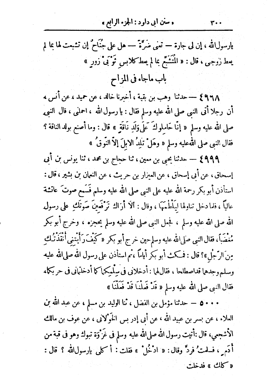 4998 - حَدَّثَنَا وَهْبُ بْنُ بَقِيَّةَ، أَخْبَرَنَا خَالِدٌ، عَنْ حُمَيْدٍ، عَنْ أَنَسٍ، أَنَّ رَجُلًا أَتَى النَّبِيَّ صَلَّى اللهُ عَلَيْهِ وَسَلَّمَ، فَقَالَ: يَا رَسُولَ اللَّهِ، احْمِلْنِي، قَالَ النَّبِيُّ صَلَّى اللهُ عَلَيْهِ وَسَلَّمَ: «§إِنَّا حَامِلُوكَ عَلَى وَلَدِ نَاقَةٍ» قَالَ: وَمَا أَصْنَعُ بِوَلَدِ النَّاقَةِ؟ فَقَالَ النَّبِيُّ صَلَّى اللهُ عَلَيْهِ وَسَلَّمَ: «وَهَلْ تَلِدُ الْإِبِلَ إِلَّا النُّوقُ»