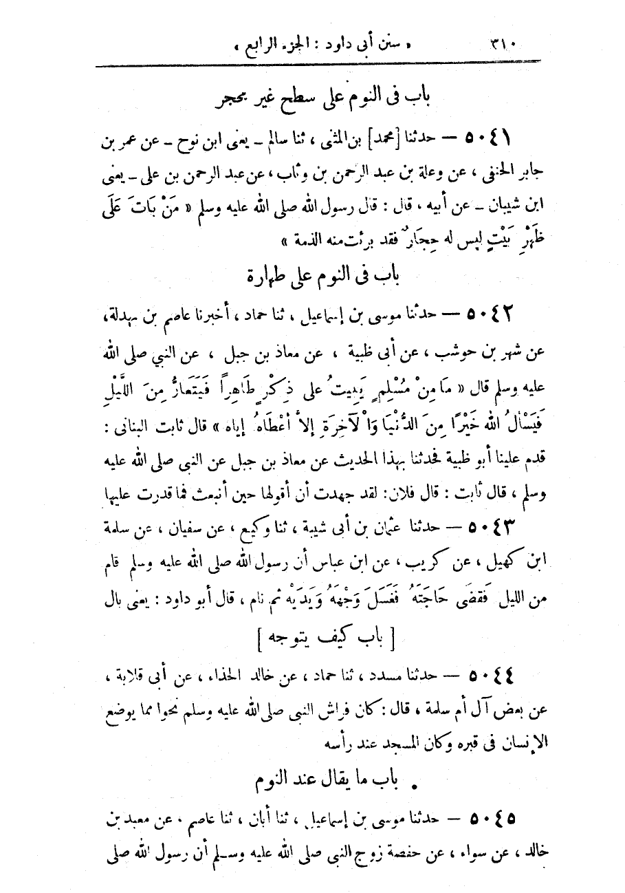 5043 - حَدَّثَنَا عُثْمَانُ بْنُ أَبِي شَيْبَةَ، حَدَّثَنَا وَكِيعٌ، عَنْ سُفْيَانَ، عَنْ سَلَمَةَ بْنِ كُهَيْلٍ، عَنْ كُرَيْبٍ، عَنِ ابْنِ عَبَّاسٍ: «أَنَّ رَسُولَ اللَّهِ صَلَّى اللهُ عَلَيْهِ وَسَلَّمَ §قَامَ مِنَ اللَّيْلِ فَقَضَى حَاجَتَهُ فَغَسَلَ وَجْهَهُ، وَيَدَيْهِ، ثُمَّ نَامَ» قَالَ أَبُو دَاوُدَ: «يَعْنِي بَالَ»