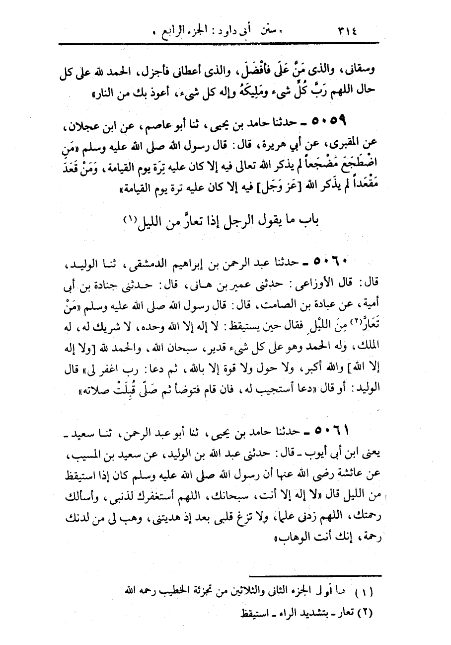 5060 - حَدَّثَنَا عَبْدُ الرَّحْمَنِ بْنُ إِبْرَاهِيمَ الدِّمَشْقِيُّ، حَدَّثَنَا الْوَلِيدُ، قَالَ: قَالَ الْأَوْزَاعِيُّ، حَدَّثَنِي عُمَيْرُ بْنُ هَانِيءٍ، قَالَ: حَدَّثَنِي جُنَادَةُ بْنُ أَبِي أُمَيَّةَ، عَنْ عُبَادَةَ بْنِ الصَّامِتِ، قَالَ: قَالَ رَسُولُ اللَّهِ صَلَّى اللهُ عَلَيْهِ وَسَلَّمَ: " §مَنْ تَعَارَّ مِنَ اللَّيْلِ فَقَالَ حِينَ يَسْتَيْقِظُ: لَا إِلَهَ إِلَّا اللَّهُ وَحْدَهُ، لَا شَرِيكَ لَهُ، لَهُ الْمُلْكُ، وَلَهُ الْحَمْدُ وَهُوَ عَلَى كُلِّ شَيْءٍ قَدِيرٌ، سُبْحَانَ اللَّهِ، وَالْحَمْدُ لِلَّهِ وَلَا إِلَهَ إِلَّا اللَّهُ وَاللَّهُ أَكْبَرُ، وَلَا حَوْلَ وَلَا قُوَّةَ إِلَّا بِاللَّهِ، ثُمَّ دَعَا: رَبِّ اغْفِرْ لِي " قَالَ الْوَلِيدُ: أَوْ قَالَ: «دَعَا اسْتُجِيبَ لَهُ، فَإِنْ قَامَ فَتَوَضَّأَ ثُمَّ صَلَّى قُبِلَتْ صَلَاتُهُ»