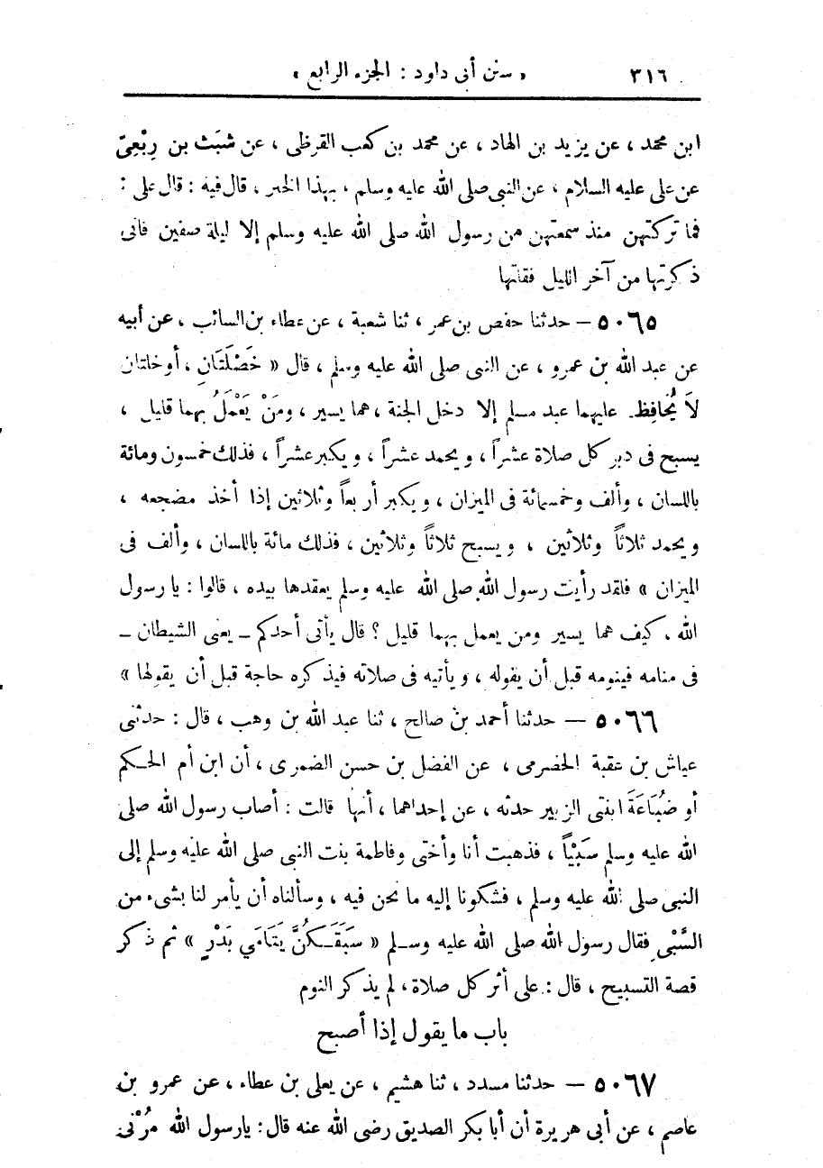 5066 - حَدَّثَنَا أَحْمَدُ بْنُ صَالِحٍ، حَدَّثَنَا عَبْدُ اللَّهِ بْنُ وَهْبٍ، قَالَ: حَدَّثَنِي عَيَّاشُ بْنُ عُقْبَةَ الْحَضْرَمِيُّ، عَنِ الْفَضْلِ بْنِ حَسَنٍ الضَّمْرِيِّ، أَنَّ ابْنَ أُمِّ الْحَكَمِ، أَوْ ضُبَاعَةَ ابْنَتَيِ الزُّبَيْرِ حَدَّثَهُ، عَنْ إِحْدَاهُمَا أَنَّهَا قَالَتْ: أَصَابَ رَسُولُ اللَّهِ سَبْيًا، فَذَهَبْتُ أَنَا وَأُخْتِي فَاطِمَةُ بِنْتُ النَّبِيِّ صَلَّى اللهُ عَلَيْهِ وَسَلَّمَ إِلَى النَّبِيِّ صَلَّى اللهُ عَلَيْهِ وَسَلَّمَ، فَشَكَوْنَا إِلَيْهِ مَا نَحْنُ فِيهِ، وَسَأَلْنَاهُ أَنْ يَأْمُرَ لَنَا بِشَيْءٍ مِنَ السَّبْيِ، فَقَالَ رَسُولُ اللَّهِ صَلَّى اللهُ عَلَيْهِ وَسَلَّمَ: «سَبَقَكُنَّ يَتَامَى بَدْرٍ» ثُمَّ ذَكَرَ قِصَّةَ التَّسْبِيحِ، قَالَ: عَلَى أَثَرِ كُلِّ صَلَاةٍ، لَمْ يَذْكُرِ النَّوْمَ