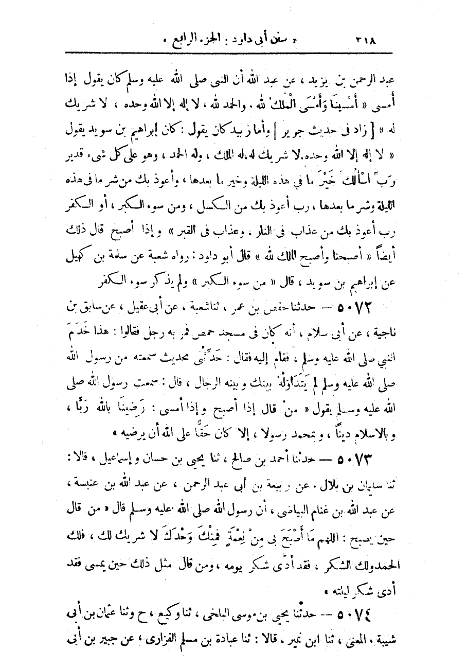 5073 - حَدَّثَنَا أَحْمَدُ بْنُ صَالِحٍ، حَدَّثَنَا يَحْيَى بْنُ حَسَّانَ، وَإِسْمَاعِيلُ، قَالَا: حَدَّثَنَا سُلَيْمَانُ بْنُ بِلَالٍ، عَنْ رَبِيعَةَ بْنِ أَبِي عَبْدِ الرَّحْمَنِ، عَنْ عَبْدِ اللَّهِ بْنِ عَنْبَسَةَ، عَنْ عَبْدِ اللَّهِ بْنِ غَنَّامٍ الْبَيَاضِيِّ، أَنَّ رَسُولَ اللَّهِ صَلَّى اللهُ عَلَيْهِ وَسَلَّمَ، قَالَ: «§مَنْ قَالَ حِينَ يُصْبِحُ اللَّهُمَّ مَا أَصْبَحَ بِي مِنْ نِعْمَةٍ فَمِنْكَ وَحْدَكَ، لَا شَرِيكَ لَكَ، فَلَكَ الْحَمْدُ، وَلَكَ الشُّكْرُ، فَقَدْ أَدَّى شُكْرَ يَوْمِهِ، وَمَنْ قَالَ مِثْلَ ذَلِكَ حِينَ يُمْسِي فَقَدْ أَدَّى شُكْرَ لَيْلَتِهِ»