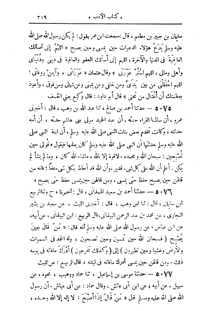5075 - حَدَّثَنَا أَحْمَدُ بْنُ صَالِحٍ، حَدَّثَنَا عَبْدُ اللَّهِ بْنُ وَهْبٍ، قَالَ: أَخْبَرَنِي عَمْرٌو، أَنَّ سَالِمًا الْفَرَّاءَ، حَدَّثَهُ أَنَّ عَبْدَ الْحَمِيدِ مَوْلَى بَنِي هَاشِمٍ، حَدَّثَهُ أَنَّ أُمَّهُ حَدَّثَتْهُ وَكَانَتْ تَخْدِمُ بَعْضَ بَنَاتِ النَّبِيِّ صَلَّى اللهُ عَلَيْهِ وَسَلَّمَ، أَنَّ ابْنَةَ النَّبِيِّ صَلَّى اللهُ عَلَيْهِ وَسَلَّمَ حَدَّثَتْهَا أَنَّ النَّبِيَّ صَلَّى اللهُ عَلَيْهِ وَسَلَّمَ كَانَ يُعَلِّمُهَا فَيَقُولُ: «§قُولِي حِينَ تُصْبِحِينَ سُبْحَانَ اللَّهِ، وَبِحَمْدِهِ لَا قُوَّةَ إِلَّا بِاللَّهِ مَا شَاءَ اللَّهُ، كَانَ وَمَا لَمْ يَشَأْ لَمْ يَكُنْ فَإِنَّهُ مَنْ قَالَهُنَّ حِينَ يُصْبِحُ حُفِظَ حَتَّى يُمْسِيَ، وَمَنْ قَالَهُنَّ حِينَ يُمْسِي حُفِظَ حَتَّى يُصْبِحَ»