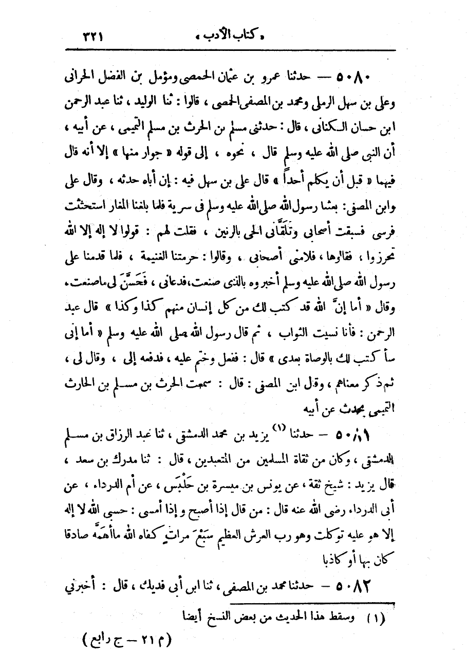 5080 - حَدَّثَنَا عَمْرُو بْنُ عُثْمَانَ الْحِمْصِيُّ، وَمُؤَمَّلُ بْنُ الْفَضْلِ الْحَرَّانِيُّ، وَعَلِيُّ بْنُ سَهْلٍ الرَّمْلِيُّ، وَمُحَمَّدُ بْنُ الْمُصَفَّى الْحِمْصِيُّ، قَالُوا: حَدَّثَنَا الْوَلِيدُ، حَدَّثَنَا عَبْدُ الرَّحْمَنِ بْنُ حَسَّانَ الْكِنَانِيُّ، قَالَ: حَدَّثَنِي مُسْلِمُ بْنُ الْحَارِثِ بْنِ مُسْلِمٍ التَّمِيمِيُّ، عَنْ أَبِيهِ أَنَّ النَّبِيَّ صَلَّى اللهُ عَلَيْهِ وَسَلَّمَ، قَالَ: نَحْوَهُ إِلَى قَوْلِهِ «جِوَارٌ مِنْهَا» إِلَّا أَنَّهُ قَالَ فِيهِمَا «قَبْلَ أَنْ يُكَلِّمَ أَحَدًا» قَالَ: عَلِيُّ بْنُ سَهْلٍ فِيهِ: إِنَّ أَبَاهُ حَدَّثَهُ، وَقَالَ عَلِيٌّ، وَابْنُ الْمُصَفَّى بَعَثَنَا رَسُولُ اللَّهِ صَلَّى اللهُ عَلَيْهِ وَسَلَّمَ فِي سَرِيَّةٍ فَلَمَّا بَلَغْنَا الْمُغَارَ اسْتَحْثَثْتُ فَرَسِي فَسَبَقْتُ أَصْحَابِي وَتَلَقَّانِي الْحَيُّ بِالرَّنِينِ، فَقُلْتُ لَهُمْ: قُولُوا لَا إِلَهَ إِلَّا اللَّهُ وَحْدَهُ تُحْرَزُوا، فَقَالُوهَا، فَلَامَنِي أَصْحَابِي، وَقَالُوا: حَرَمْتَنَا الْغَنِيمَةَ، فَلَمَّا قَدِمْنَا عَلَى رَسُولِ اللَّهِ صَلَّى اللهُ عَلَيْهِ وَسَلَّمَ أَخْبَرُوهُ بِالَّذِي صَنَعْتُ، فَدَعَانِي، فَحَسَّنَ لِي مَا صَنَعْتُ، وَقَالَ: «أَمَا إِنَّ اللَّهَ قَدْ كَتَبَ لَكَ مِنْ كُلِّ إِنْسَانٍ مِنْهُمْ كَذَا وَكَذَا» قَالَ عَبْدُ الرَّحْمَنِ: فَأَنَا نَسِيتُ الثَّوَابَ، ثُمَّ قَالَ رَسُولُ اللَّهِ صَلَّى اللهُ عَلَيْهِ وَسَلَّمَ: «أَمَا إِنِّي سَأَكْتُبُ لَكَ بِالْوَصَاةِ بَعْدِي» قَالَ: فَفَعَلَ وَخَتَمَ عَلَيْهِ، فَدَفَعَهُ إِلَيَّ، وَقَالَ لِي، ثُمَّ ذَكَرَ مَعْنَاهُمْ، وَقَالَ ابْنُ الْمُصَفَّى: قَالَ: سَمِعْتُ الْحَارِثَ بْنَ مُسْلِمِ بْنِ الْحَارِثِ التَّمِيمِيَّ، يُحَدِّثُ عَنْ أَبِيهِ