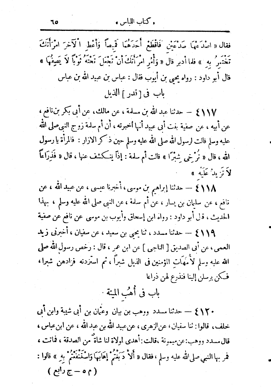 4119 - حَدَّثَنَا مُسَدَّدٌ، حَدَّثَنَا يَحْيَى بْنُ سَعِيدٍ، عَنْ سُفْيَانَ، أَخْبَرَنِي زَيْدٌ الْعَمِّيُّ، عَنْ أَبِي الصِّدِّيقِ النَّاجِيِّ، عَنِ ابْنِ عُمَرَ، قَالَ: «§رَخَّصَ رَسُولُ اللَّهِ صَلَّى اللهُ عَلَيْهِ وَسَلَّمَ لِأُمَّهَاتِ الْمُؤْمِنِينَ فِي الذَّيْلِ شِبْرًا، ثُمَّ اسْتَزَدْنَهُ، فَزَادَهُنَّ شِبْرًا، فَكُنَّ يُرْسِلْنَ إِلَيْنَا فَنَذْرَعُ لَهُنَّ ذِرَاعًا»