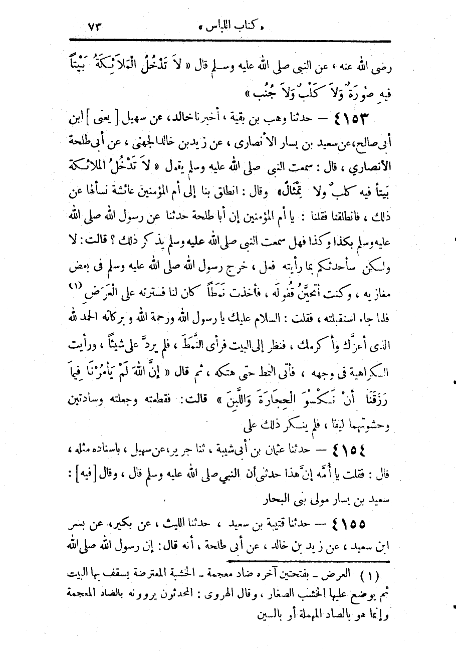 4153 - حَدَّثَنَا وَهْبُ بْنُ بَقِيَّةَ، أَخْبَرَنَا خَالِدٌ، عَنْ سُهَيْلٍ يَعْنِي ابْنَ أَبِي صَالِحٍ، عَنْ سَعِيدِ بْنِ يَسَارٍ الْأَنْصَارِيِّ، عَنْ زَيْدِ بْنِ خَالِدٍ الْجُهَنِيِّ، عَنْ أَبِي طَلْحَةَ الْأَنْصَارِيِّ، قَالَ: سَمِعْتُ النَّبِيَّ صَلَّى اللهُ عَلَيْهِ وَسَلَّمَ يَقُولُ: «لَا تَدْخُلُ الْمَلَائِكَةُ بَيْتًا فِيهِ كَلْبٌ، وَلَا تِمْثَالٌ»، وَقَالَ: انْطَلِقْ بِنَا إِلَى أُمِّ الْمُؤْمِنِينَ عَائِشَةَ نَسْأَلْهَا عَنْ ذَلِكَ، فَانْطَلَقْنَا، فَقُلْنَا: يَا أُمَّ الْمُؤْمِنِينَ، إِنَّ أَبَا طَلْحَةَ حَدَّثَنَا عَنْ رَسُولِ اللَّهِ صَلَّى اللهُ عَلَيْهِ وَسَلَّمَ بِكَذَا، وَكَذَا، فَهَلْ سَمِعْتِ النَّبِيَّ صَلَّى اللهُ عَلَيْهِ وَسَلَّمَ يَذْكُرُ ذَلِكَ؟ قَالَتْ: لَا، وَلَكِنْ سَأُحَدِّثُكُمْ بِمَا رَأَيْتُهُ فَعَلَ، خَرَجَ رَسُولُ اللَّهِ صَلَّى اللهُ عَلَيْهِ وَسَلَّمَ فِي بَعْضِ مَغَازِيهِ، وَكُنْتُ أَتَحَيَّنُ قُفُولَهُ، فَأَخَذْتُ نَمَطًا كَانَ لَنَا، فَسَتَرْتُهُ عَلَى الْعَرَضِ، فَلَمَّا جَاءَ اسْتَقْبَلْتُهُ، فَقُلْتُ: السَّلَامُ عَلَيْكَ يَا رَسُولَ اللَّهِ وَرَحْمَةُ اللَّهِ وَبَرَكَاتُهُ، الْحَمْدُ لِلَّهِ الَّذِي أَعَزَّكَ وَأَكْرَمَكَ، فَنَظَرَ إِلَى الْبَيْتِ فَرَأَى النَّمَطَ، فَلَمْ يَرُدَّ عَلَيَّ شَيْئًا، وَرَأَيْتُ الْكَرَاهِيَةَ فِي وَجْهِهِ، فَأَتَى النَّمَطَ حَتَّى هَتَكَهُ، ثُمَّ قَالَ: «إِنَّ §اللَّهَ لَمْ يَأْمُرْنَا فِيمَا رَزَقَنَا أَنْ نَكْسُوَ الْحِجَارَةَ وَاللَّبِنَ» قَالَتْ: فَقَطَعْتُهُ وَجَعَلْتُهُ وِسَادَتَيْنِ، وَحَشَوْتُهُمَا لِيفًا، فَلَمْ يُنْكِرْ ذَلِكَ عَلَيَّ