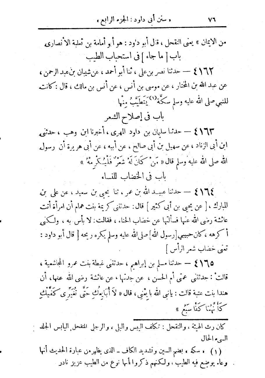 4164 - حَدَّثَنَا عُبَيْدُ اللَّهِ بْنُ عُمَرَ، حَدَّثَنَا يَحْيَى بْنُ سَعِيدٍ، عَنْ عَلِيِّ بْنِ الْمُبَارَكِ، قَالَ: حَدَّثَتْنِي كَرِيمَةُ بِنْتُ هَمَّامٍ، أَنَّ امْرَأَةً أَتَتْ عَائِشَةَ رَضِيَ اللَّهُ عَنْهَا، فَسَأَلَتْهَا عَنْ خِضَابِ الْحِنَّاءِ، فَقَالَتْ: «لَا بَأْسَ بِهِ، وَلَكِنْ أَكْرَهُهُ، §كَانَ حَبِيبِي رَسُولُ اللَّهِ صَلَّى اللهُ عَلَيْهِ وَسَلَّمَ يَكْرَهُ رِيحَهُ». قَالَ أَبُو دَاوُدَ: «تَعْنِي خِضَابَ شَعْرِ الرَّأْسِ»