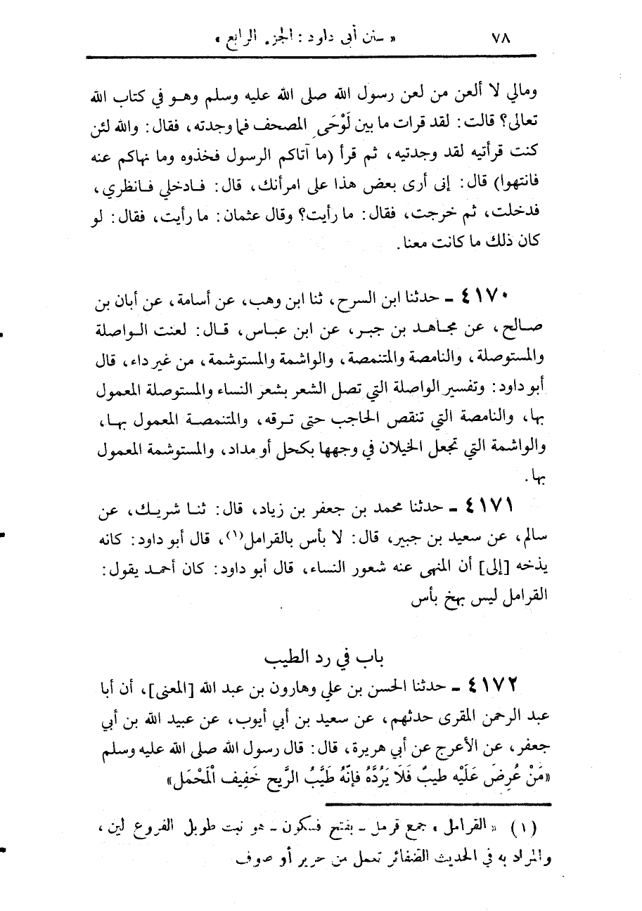 4171 - حَدَّثَنَا مُحَمَّدُ بْنُ جَعْفَرِ بْنِ زِيَادٍ، قَالَ: حَدَّثَنَا شَرِيَكٌ، عَنْ سَالِمٍ، عَنْ سَعِيدِ بْنِ جُبَيْرٍ، قَالَ: «§لَا بَأْسَ بِالْقَرَامِلِ»، قَالَ أَبُو دَاوُدَ: «كَأَنَّهُ يَذْهَبُ إِلَى أَنَّ الْمَنْهِيَّ عَنْهُ شُعُورُ النِّسَاءِ»، قَالَ أَبُو دَاوُدَ: كَانَ أَحْمَدُ يَقُولُ: الْقَرَامِلُ لَيْسَ بِهِ بَأْسٌ