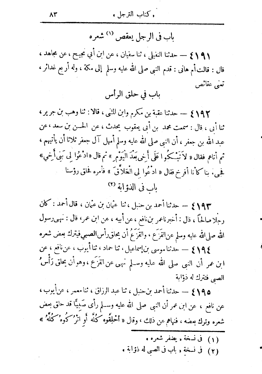 4195 - حَدَّثَنَا أَحْمَدُ بْنُ حَنْبَلٍ، حَدَّثَنَا عَبْدُ الرَّزَّاقِ، حَدَّثَنَا مَعْمَرٌ، عَنْ أَيُّوبَ، عَنْ نَافِعٍ، عَنِ ابْنِ عُمَرَ، أَنَّ النَّبِيَّ صَلَّى اللهُ عَلَيْهِ وَسَلَّمَ: رَأَى صَبِيًّا قَدْ حُلِقَ بَعْضُ شَعْرِهِ وَتُرِكَ بَعْضُهُ، فَنَهَاهُمْ عَنْ ذَلِكَ، وَقَالَ: «§احْلِقُوهُ كُلَّهُ، أَوِ اتْرُكُوهُ كُلَّهُ»
