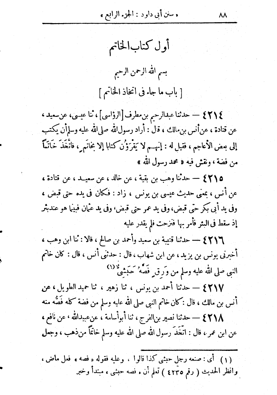 4218 - حَدَّثَنَا نُصَيْرُ بْنُ الْفَرَجِ، حَدَّثَنَا أَبُو أُسَامَةَ، عَنْ عُبَيْدِ اللَّهِ، عَنْ نَافِعٍ، عَنِ ابْنِ عُمَرَ، قَالَ: §اتَّخَذَ رَسُولُ اللَّهِ صَلَّى اللهُ عَلَيْهِ وَسَلَّمَ خَاتَمًا مِنْ ذَهَبٍ، وَجَعَلَ -[89]- فَصَّهُ مِمَّا يَلِي بَطْنَ كَفِّهِ، وَنَقَشَ فِيهِ مُحَمَّدٌ رَسُولُ اللَّهِ، فَاتَّخَذَ النَّاسُ خَوَاتِمَ الذَّهَبِ، فَلَمَّا رَآهُمْ قَدِ اتَّخَذُوهَا رَمَى بِهِ، وَقَالَ: «لَا أَلْبَسُهُ أَبَدًا»، ثُمَّ اتَّخَذَ خَاتَمًا مِنْ فِضَّةٍ، نَقَشَ فِيهِ مُحَمَّدٌ رَسُولُ اللَّهِ، ثُمَّ لَبِسَ الْخَاتَمَ بَعْدَهُ أَبُو بَكْرٍ، ثُمَّ لَبِسَهُ بَعْدَ أَبِي بَكْرٍ عُمَرُ، ثُمَّ لَبِسَهُ بَعْدَهُ عُثْمَانُ، حَتَّى وَقَعَ فِي بِئْرِ أَرِيسٍ " قَالَ أَبُو دَاوُدَ: «وَلَمْ يَخْتَلِفِ النَّاسُ عَلَى عُثْمَانَ حَتَّى سَقَطَ الْخَاتَمُ مِنْ يَدِهِ»