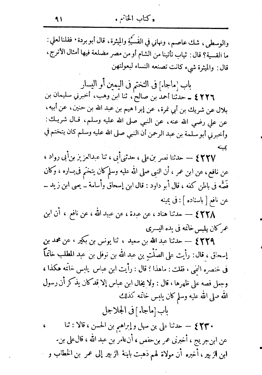 4227 - حَدَّثَنَا نَصْرُ بْنُ عَلِيٍّ، حَدَّثَنِي أَبِي، حَدَّثَنَا عَبْدُ الْعَزِيزِ بْنُ أَبِي رَوَّادٍ، عَنْ نَافِعٍ، عَنِ ابْنِ عُمَرَ، «§أَنَّ النَّبِيَّ صَلَّى اللهُ عَلَيْهِ وَسَلَّمَ كَانَ يَتَخَتَّمُ فِي يَسَارِهِ، وَكَانَ فَصُّهُ فِي بَاطِنِ كَفِّهِ» قَالَ أَبُو دَاوُدَ: قَالَ ابْنُ إِسْحَاقَ، وَأُسَامَةُ يَعْنِي ابْنَ زَيْدٍ، عَنْ نَافِعٍ، بِإِسْنَادِهِ فِي يَمِينِهِ