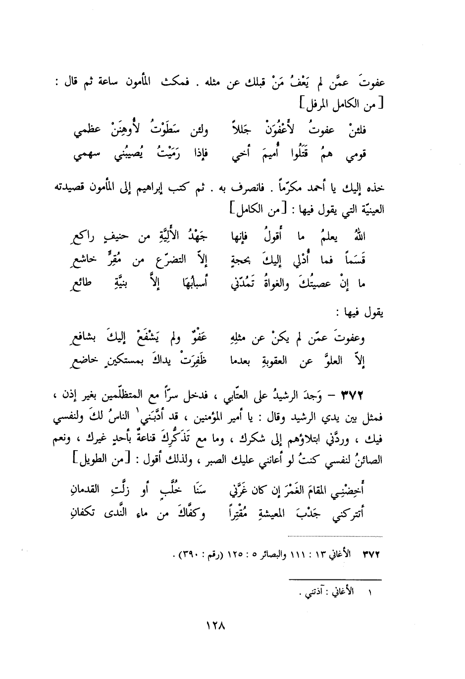 «372» - وجد الرشيد على العتّابي، فدخل سرّا مع المتظلّمين بغير إذن، فمثل بين يدي الرشيد وقال: يا أمير المؤمنين، قد أدّبني [1] الناس لك ولنفسي فيك، وردّني ابتلاؤهم إلى شكرك، وما مع تذكّرك قناعة بأحد غيرك، ونعم الصائن لنفسي كنت لو أعانني عليك الصبر، ولذلك أقول: [من الطويل]