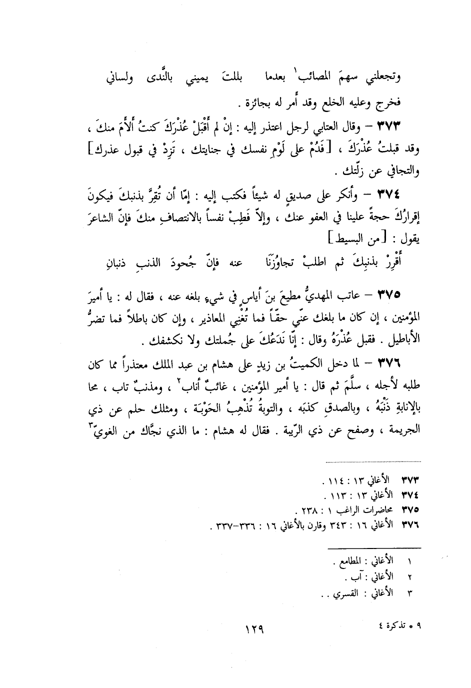 «376» - لما دخل الكميت بن زيد على هشام بن عبد الملك معتذرا مما كان طلبه لأجله، سلّم ثم قال: يا أمير المؤمنين، غائب أناب [2] ، ومذنب تاب، محا بالإنابة ذنبه، وبالصدق كذبه، والتوبة تذهب الحوبة، ومثلك حلم عن ذي الجريمة، وصفح عن ذي الرّيبة. فقال له هشام: ما الذي نجّاك من اللغويّ [3]