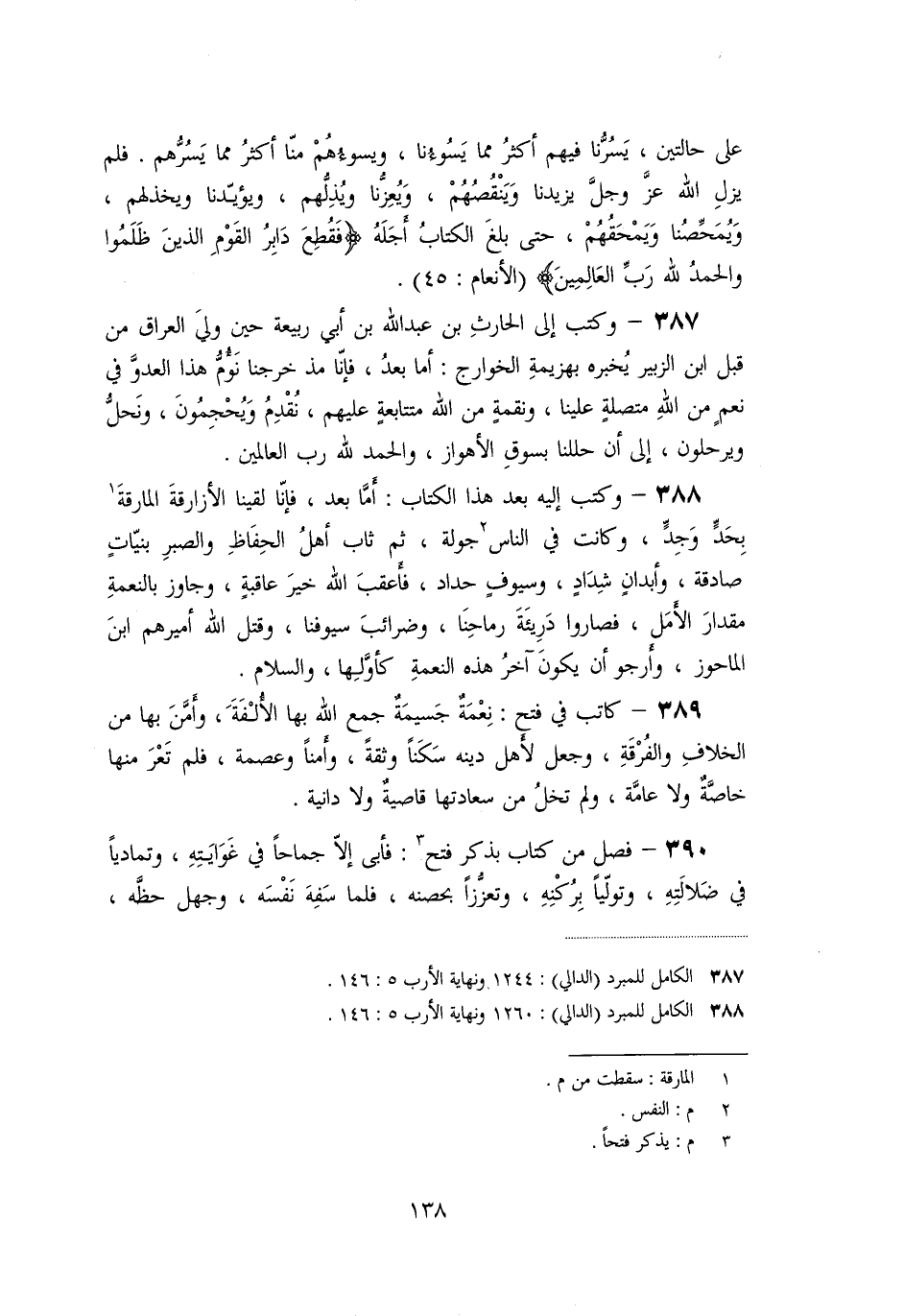 «387» - وكتب إلى الحارث بن عبد الله بن أبي ربيعة حين ولي العراق من قبل ابن الزبير يخبره بهزيمة الخوارج: أما بعد، فإنّا مذ خرجنا نؤمّ هذا العدوّ في نعم من الله متصلة علينا، ونقمة من الله متتابعة عليهم، نقدم ويحجمون، ونحلّ ويرحلون، إلى أن حللنا بسوق الأهواز، والحمد لله رب العالمين.
