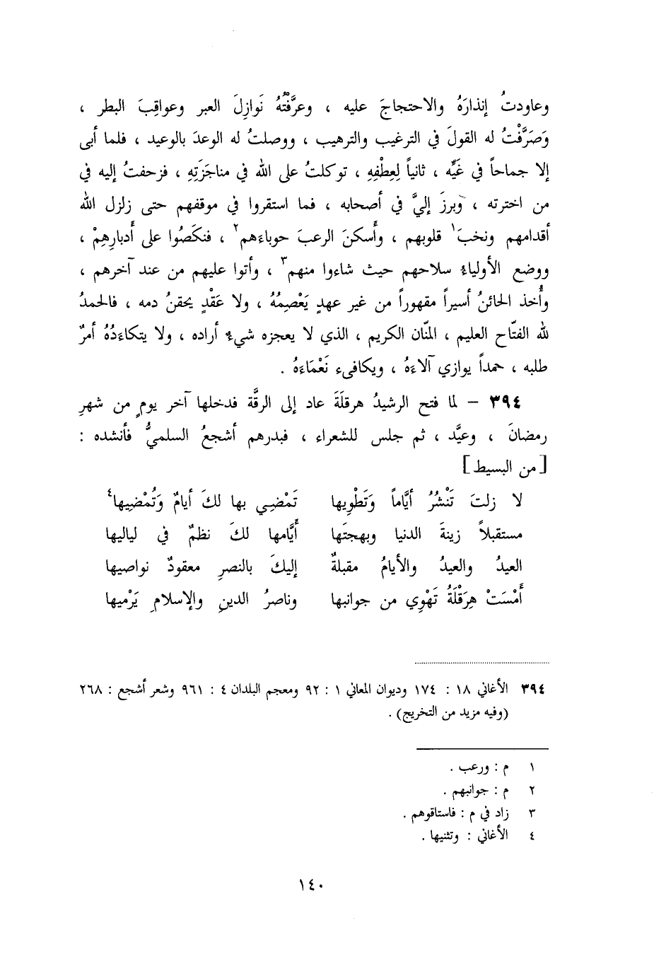 «394» - لما فتح الرشيد هرقلة عاد إلى الرقّة فدخلها آخر يوم من شهر رمضان، وعيّد، ثم جلس للشعراء، فبدرهم أشجع السلميّ فأنشده: