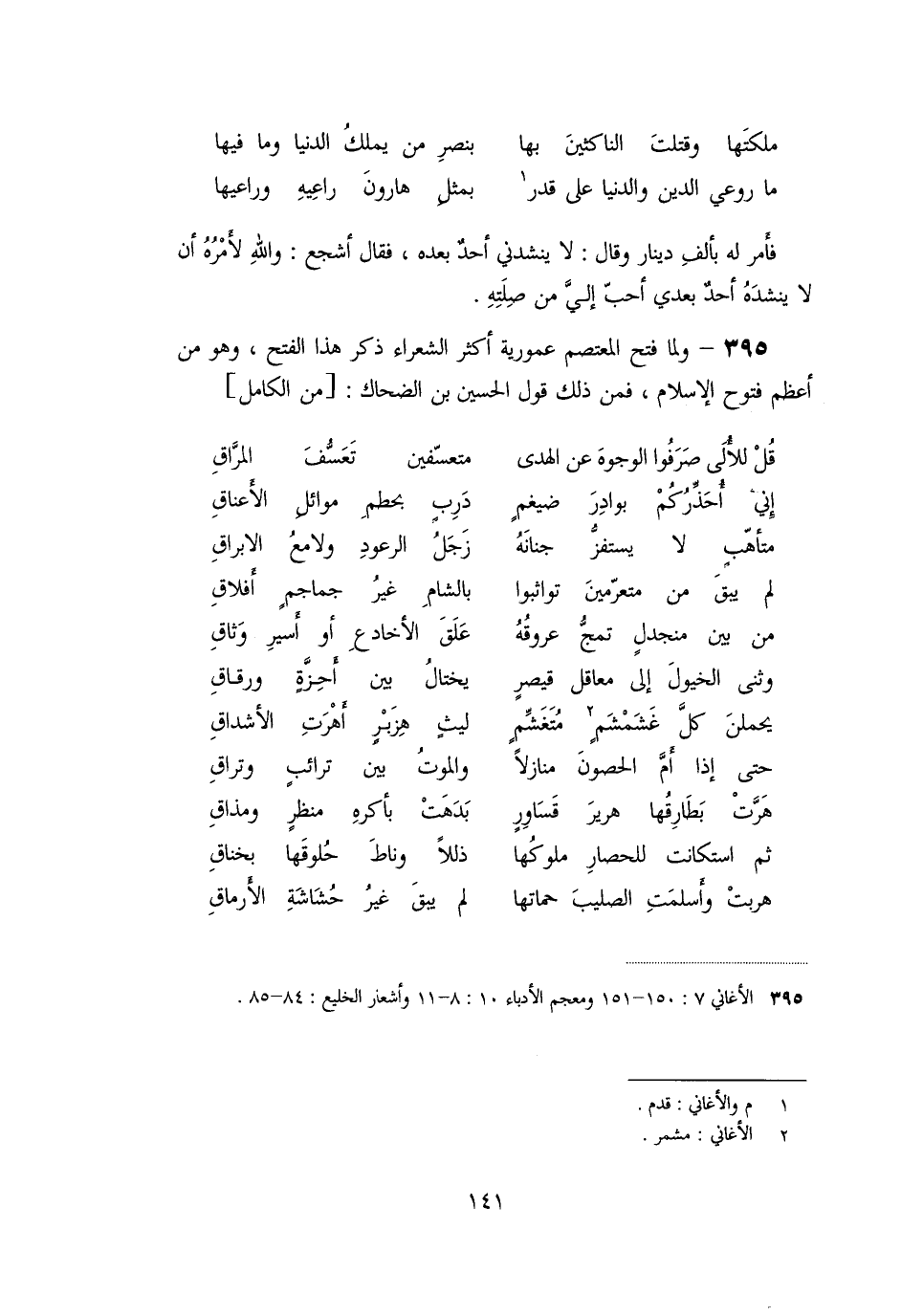 «395» - ولما فتح المعتصم عمورية أكثر الشعراء ذكر هذا الفتح، وهو من أعظم فتوح الإسلام، فمن ذلك قول الحسين بن الضحاك: [من الكامل]