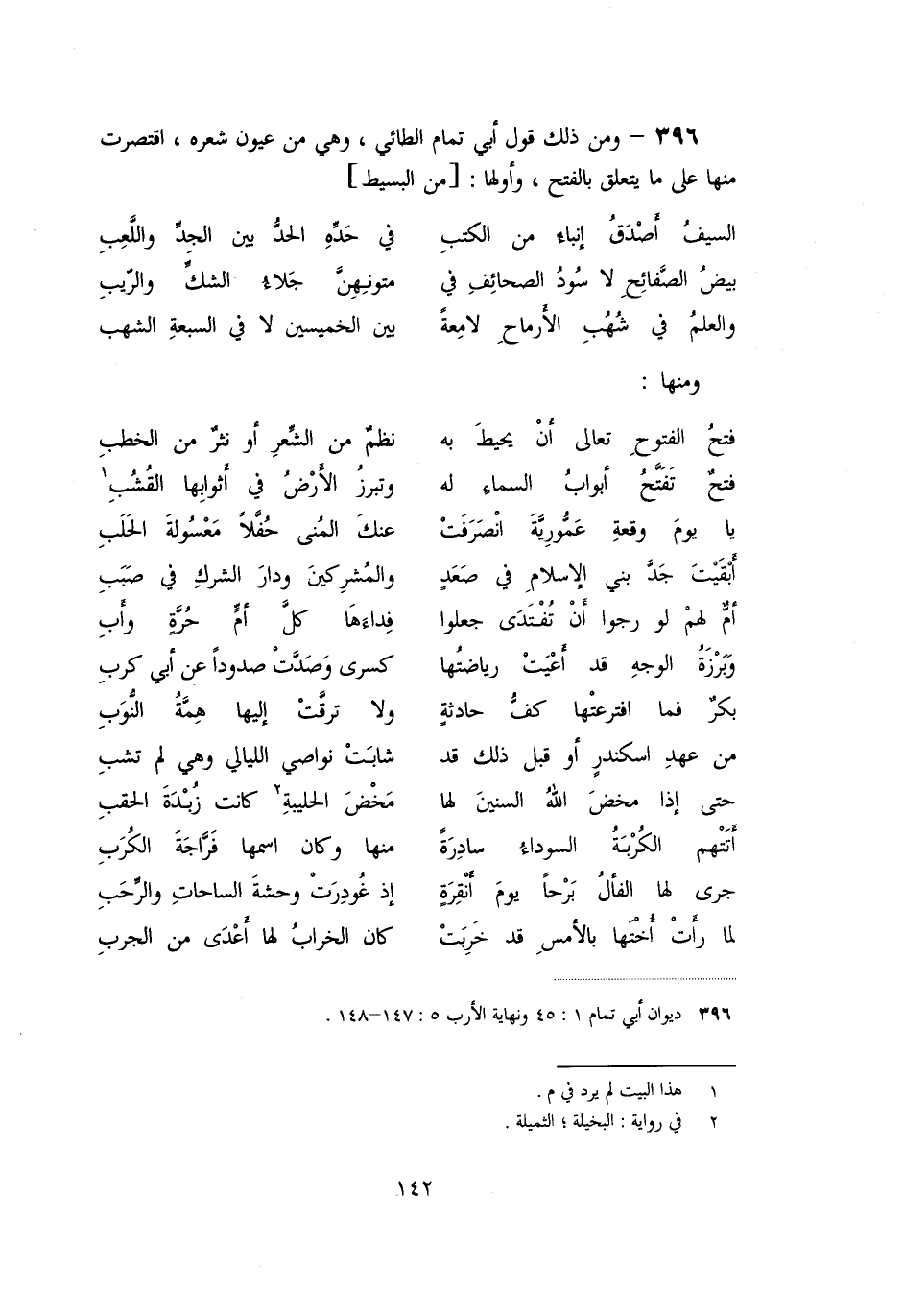 «396» - ومن ذلك قول أبي تمام الطائي، وهي من عيون شعره، اقتصرت منها على ما يتعلق بالفتح وأولها: [من البسيط]
