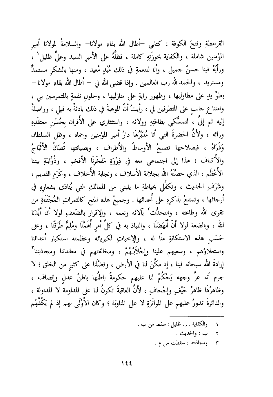القرامطة وفتح الكوفة: كتابي- أطال الله بقاء مولانا- والسلامة لمولانا أمير المؤمنين شاملة، والكفاية بحوزته كاملة، فظلّه على الأمير السيد وعليّ ظليل [1] ، ورأيه فينا حسن جميل، وأنا للنعمة في ذلك مبد معيد، ومنها بالشكر مستمدّ ومستزيد، والحمد لله رب العالمين. وإذا قضى الله لي- أطال الله بقاء مولانا- بعلوّ يد على مطاوليها، وظهور راية على منازليها، وحلول نقمة بالمتمرسين بي، وامتناع جانب على المتطرفين لي، رأيت أنّ الموهبة في ذلك بادئة به قبلي، وواصلة إليه ثم إليّ، لتمسّكي بطاعته وولائه، واستئثاري على الأقران بحسن معتقده ورائه، ولأنّ الحضرة التي أنا مدبّرها دار أمير المؤمنين وحماه، وظل السلطان وذراه، فبصلاحها تصلح الأوساط والأطراف، وبصيانتها تصان الأثباج والأكناف؛ هذا إلى اجتماعي معه في ذروة مفخرنا الأفخم، وذؤابة بيتنا الأعظم، الذي حصّنه الله بجلالة الأسلاف، ونجابة الأخلاف، وكرم القديم، وشرف الحديث، وتكفّلي بحياطة ما يليني من الممالك التي ينادى بشعاره في أرجائها، وتمتنع بذكره على أعدائها. وجميع هذه المنح كالثمرات المجتناة من تقوى الله وطاعته، والتحدّث [2] بآلائه ونعمه، والإقرار بالضّعف لولا أن أيّدنا الله، وبالضعة لولا أن أنهضنا، واللياذ به في كلّ أمر أهمّنا وملمّ طرقنا، وعلى حسب هذه الاستكانة منّا له، والإخبات لكبريائه وعظمته استكبار أعدائنا واستعلاؤهم، وسعيهم علينا وإجلابهم، ومخالفتهم في معاندتنا ومجاذبتنا [3] إرادة الله سبحانه فينا، إذ مكّن لنا في الأرض، وفضّلنا على كثير من الخلق؛ لا جرم أنه عزّ وجهه يحكم لنا عليهم حكومة باطنها باطن عدل وإنصاف، وظاهرها ظاهر حيف وإجحاف، لأنّ العاقبة تكون لنا على المداومة لا المداولة، والدائرة تدور عليهم على المتواترة لا على المناوبة؛ وكان الأولى بهم إذ لم يكفّهم