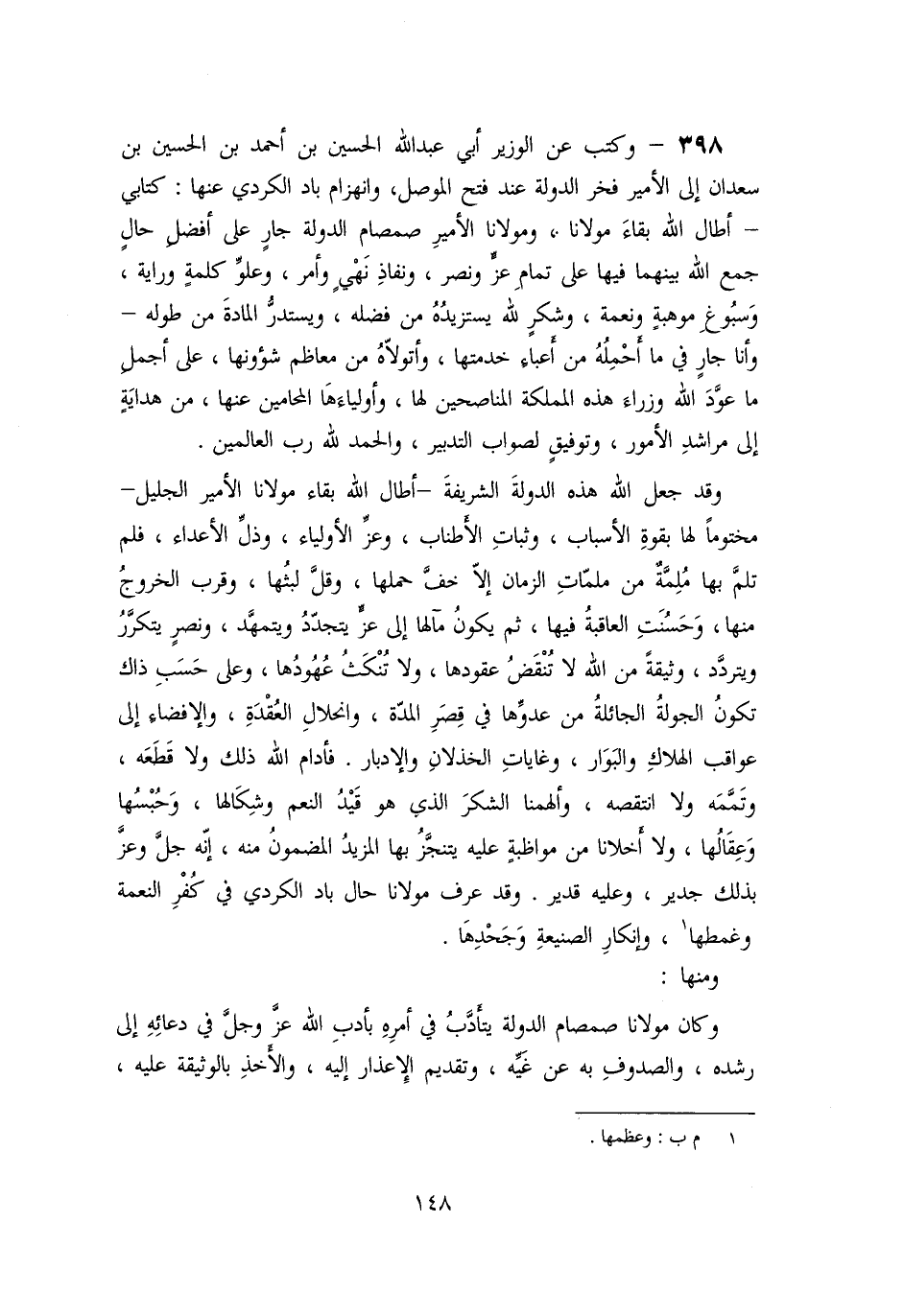 398- وكتب عن الوزير أبي عبد الله الحسين بن أحمد بن الحسين بن سعدان إلى الأمير فخر الدولة عند فتح الموصل، وانهزام باد الكردي عنها: كتابي- أطال الله بقاء مولانا، ومولانا الأمير صمصام الدولة جار على أفضل حال جمع الله بينهما فيها على تمام عزّ ونصر، ونفاذ نهي وأمر، وعلوّ كلمة وراية، وسبوغ موهبة ونعمة، وشكر لله يستزيده من فضله، ويستدرّ المادة من طوله- وأنا جار في ما أحمله من أعباء خدمتها، وأتولّاه من معاظم شؤونها، على أجمل ما عوّد الله وزراء هذه المملكة المناصحين لها، وأولياءها المحامين عنها، من هداية إلى مراشد الأمور، وتوفيق لصواب التدبير، والحمد لله رب العالمين.