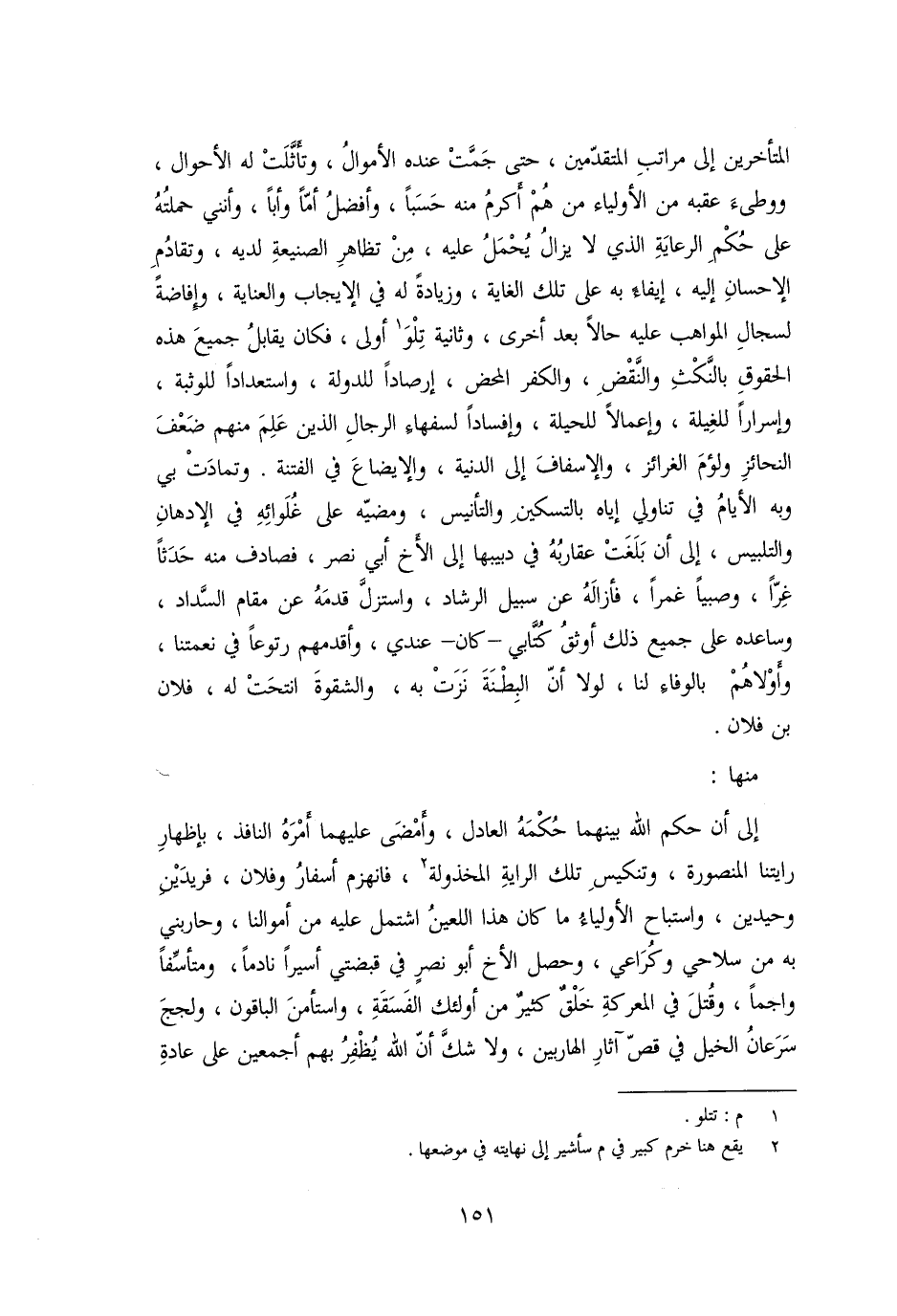 المتأخرين إلى مراتب المتقدّمين، حتى جمّت عنده الأموال، وتأثّلت له الأحوال، ووطىء عقبه من الأولياء من هم أكرم منه حسبا، وأفضل أمّا وأبا، وأنني حملته على حكم الرعاية الذي لا يزال يحمل عليه، من تظاهر الصنيعة لديه، وتقادم الإحسان إليه، إيفاء به على تلك الغاية، وزيادة له في الإيجاب والعناية، وإفاضة لسجال المواهب عليه حالا بعد أخرى، وثانية تلو [1] أولى، فكان يقابل جميع هذه الحقوق بالنّكث والنّقض، والكفر المحض، إرصادا للدولة، واستعدادا للوثبة، وإسرارا للغيلة، وإعمالا للحيلة، وإفسادا لسفهاء الرجال الذين علم منهم ضعف النحائز ولؤم الغرائز، والإسفاف إلى الدنية، والإيضاع في الفتنة. وتمادت بي وبه الأيام في تناولي إياه بالتسكين والتأنيس، ومضيّه على غلوائه في الإدهان والتلبيس، إلى أن بلغت عقاربه في دبيبها إلى الأخ أبي نصر، فصادف منه حدثا غرّا، وصبيا غمرا، فأزاله عن سبيل الرشاد، واستزلّ قدمه عن مقام السّداد، وساعده على جميع ذلك أوثق كتّابي- كان- عندي، وأقدمهم رتوعا في نعمتنا، وأولاهم بالوفاء لنا، لولا أنّ البطنة نزت به، والشقوة انتحت له، فلان بن فلان.