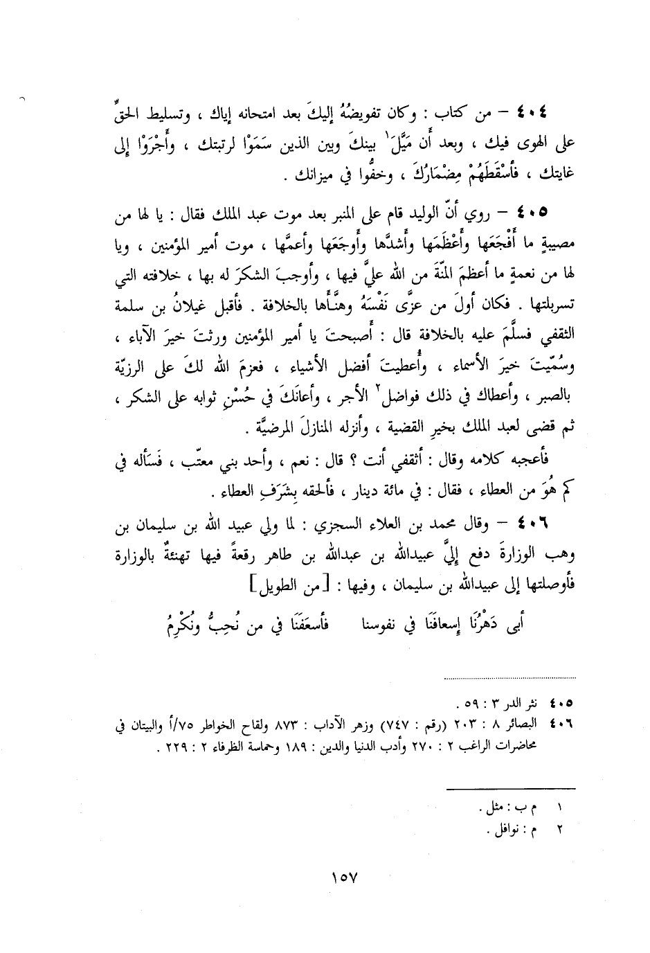 «406» - وقال محمد بن العلاء السجزي: لما ولي عبيد الله بن سليمان بن وهب الوزارة دفع إليّ عبيد الله بن عبد الله بن طاهر رقعة فيها تهنئة بالوزارة فأوصلتها إلى عبيد الله بن سليمان، وفيها: [من الطويل]