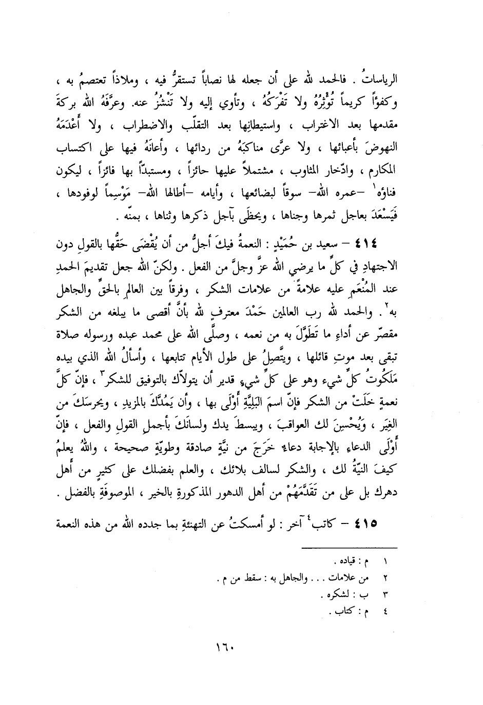 414- سعيد بن حميد: النعمة فيك أجلّ من أن يقضى حقّها بالقول دون الاجتهاد في كلّ ما يرضي الله عزّ وجلّ من الفعل. ولكنّ الله جعل تقديم الحمد عند المنعم عليه علامة من علامات الشكر، وفرقا بين العالم بالحقّ والجاهل به [2] . والحمد لله رب العالمين حمد معترف لله بأن أقصى ما يبلغه من الشكر مقصّر عن أداء ما تطوّل به من نعمه، وصلّى الله على محمد عبده ورسوله صلاة تبقى بعد موت قائلها، ويتّصل على طول الأيام تتابعها، وأسأل الله الذي بيده ملكوت كلّ شيء وهو على كلّ شيء قدير أن يتولّاك بالتوفيق للشكر [3] ، فإنّ كلّ نعمة خلت من الشكر فإنّ اسم البليّة أولى بها، وأن يمدّك بالمزيد، ويحرسك من الغير، ويحسن لك العواقب، ويبسط يدك ولسانك بأجمل القول والفعل، فإنّ أولى الدعاء بالإجابة دعاء خرج من نيّة صادقة وطويّة صحيحة، والله يعلم كيف النيّة لك، والشكر لسالف بلائك، والعلم بفضلك على كثير من أهل دهرك بل على من تقدّمهم من أهل الدهور المذكورة بالخير، الموصوفة بالفضل.