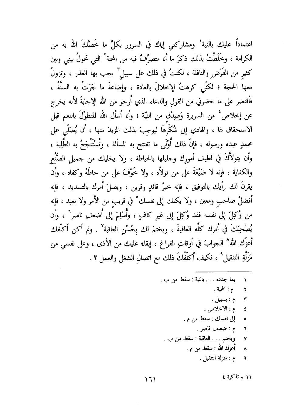 اعتمادا عليك بالنية [1] ومشاركتي إياك في السرور بكلّ ما خصّك الله به من الكرامة، وخلطت بذلك ذكر ما أنا متصرّف فيه من المحنة [2] التي تحول بيني وبين كثير من الفرض والنافلة، لكنت في ذلك على سبيل [3] يجب بها العذر، وتزول معها الحجة؛ لكنّي كرهت الإخلال بالعادة، وإضاعة ما جرت به السنّة، فأقتصر على ما حضرني من القول والدعاء الذي أرجو من الله الإجابة لأنه يخرج عن إخلاص [4] من السريرة وصدق من النيّة؛ وأنا أسأل الله المتطوّل بالنعم قبل الاستحقاق لها، والهادي إلى شكرها ليوجب بذلك المزيد منها، أن يصلّي على محمد عبده ورسوله، فإنّ ذلك أولى ما تفتتح به المسألة، وتستنجح به الطّلبة، وأن يتولّاك في لطيف أمورك وجليلها بالحياطة، ولا يخليك من جميل الصنّع والكفاية، فإنه لا ضيعة على من تولّاه، ولا خوف على من حاطه وكفاه، وأن يقرن لك رأيك بالتوفيق، فإنه خير قائد وقرين، ويصل أمرك بالتسديد، فإنه أفضل صاحب ومعين، ولا يكلك إلى نفسك [5] في قريب من الأمر ولا بعيد، فإنه من وكل إلى نفسه فقد وكل إلى غير كاف، وأسلم إلى أضعف ناصر [6] ، وأن يصحبك في أمرك كلّه العافية، ويختم لك بحسن العاقبة [7] . ولم أكن أكلّفك أعزّك الله [8] الجواب في أوقات الفراغ، إبقاء عليك من الأذى، وعلى نفسي من مزلّة التثقيل [9] ، فكيف أكلّفك ذلك مع اتصال الشغل والعمل؟.