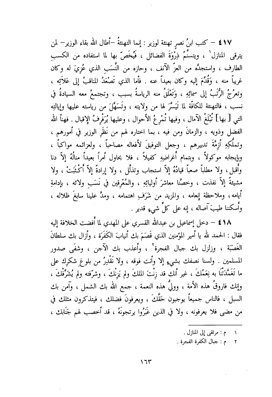 417- كتب ابن نصر تهنئة لوزير: إنما التهنئة- أطال الله بقاء الوزير- لمن يترقى المنازل [1] ، ويتسنّم ذروة الفضائل، فيخصّ بها لما استفاده من الكسب الطارف، واستجدّه من العزّ الآنف، وحازه من النّسب الذي عزي له وكان غريبا منه، وقدّم إليه وكان بعيدا عنه. فأما الذي تصعد المناقب إلى علائه، وتعرج الرّتب إلى سمائه، وتعلق منه الرياسة بسبب، وتجتمع معه السيادة في نسب، فالتهنئة للكافّة لما تيسّر لها من ولايته، وتسهّل من رياسته عليها وإيالته التي [بها] تبلغ الآمال، وفيها تمرع الأحوال، وعليها يرفرف الإقبال. فهنأ الله الفضل وذويه، والزمان ومن فيه، بما اختاره لهم من نظر الوزير في أمورهم، وتملّكه أزمّة تدبيرهم، وجعل التوفيق لأفعاله مصاحبا، ولعزائمه مواكبا، وبإيجابه موكولا، وبتمام أغراضه كفيلا، فلا يحاول أمرا بعيدا مناله إلّا دنا وأقبل، ولا مطلبا صعبا قياده إلّا استجاب وتذلّل، ولا إرادة إلّا أكثبت، ولا مشيئة إلّا نفذت، وخصّنا معاشر أوليائه، والمعرقين في نسب ولائه، بإدامة أيامه، وملاحظة إنعامه، والمزيد من شرف اهتمامه، ومدّ علينا سابغ ظلاله، وأسكننا طيب آصاله، إنه على كلّ شيء قدير.