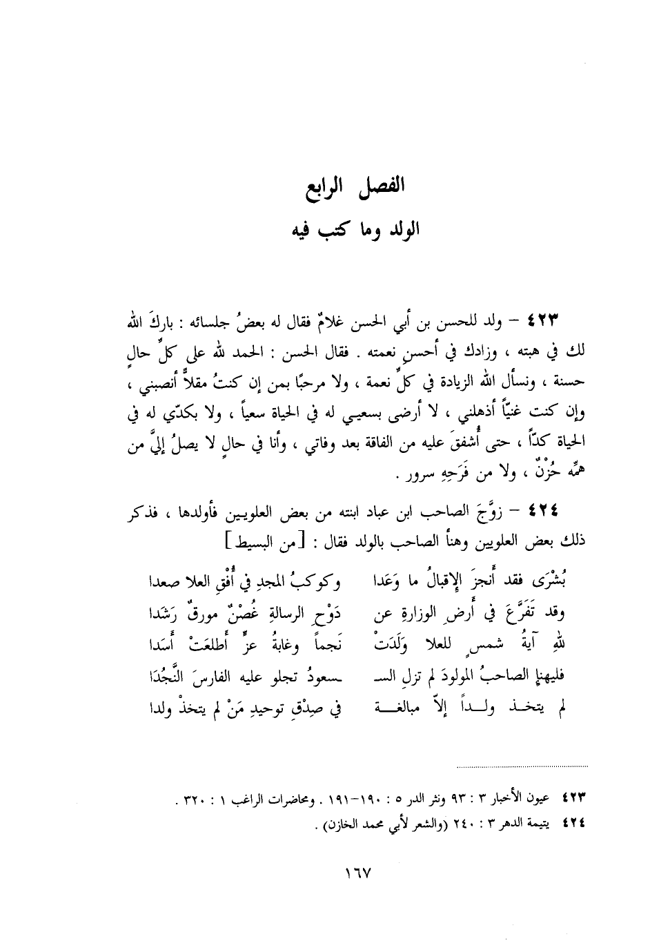 «424» - زوّج الصاحب ابن عباد ابنته من بعض العلويين فأولدها، فذكر ذلك بعض العلويين وهنأ الصاحب بالولد فقال: [من البسيط]