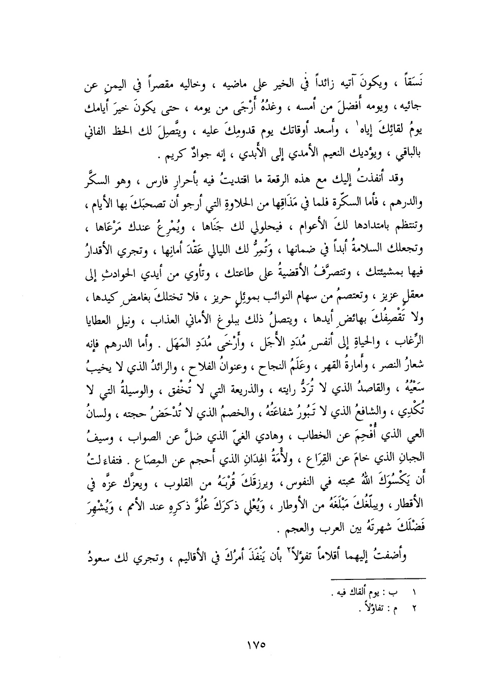 وقد أنفذت إليك مع هذه الرقعة ما اقتديت فيه بأحرار فارس، وهو السكّر والدرهم، فأما السكّرة فلما في مذاقها من الحلاوة التي أرجو أن تصحبك بها الأيام، وتنتظم بامتدادها لك الأعوام، فيحلولي لك جناها، ويمرع عندك مرعاها، وتجعلك السلامة أبدا في ضمانها، وتمرّ لك الليالي عقد أمانها، وتجري الأقدار فيها بمشيئتك، وتتصرّف الأقضية على طاعتك، وتأوي من أيدي الحوادث إلى معقل عزيز، وتعتصم من سهام النوائب بموئل حريز، فلا تختلك بغامض كيدها، ولا تقصفك بهائض أيدها، ويتصل ذلك ببلوغ الأماني العذاب، ونيل العطايا الرّغاب، والحياة إلى أنفس مدّد الأجل، وأرخى مدد المهل. وأما الدرهم فإنه شعار النصر، وأمارة القهر، وعلم النجاح، وعنوان الفلاح، والرائد الذي لا يخيب سعيه، والقاصد الذي لا تردّ رايته، والذريعة التي لا تخفق، والوسيلة التي لا تكدي، والشافع الذي لا تبور شفاعته، والخصم الذي لا تدحض حجته، ولسان العي الذي أفحم عن الخطاب، وهادي الغي الذي ضلّ عن الصواب، وسيف الجبان الذي خام عن القراع، ولأمة الهدان الذي أحجم عن المصاع. فتفاءلت أن يكسوك الله محبته في النفوس، ويرزقك قربه من القلوب، ويعزّك عزّه في الأقطار، ويبلّغك مبلغه من الأوطار، ويعلي ذكرك علوّ ذكره عند الأمم، ويشهر فضلك شهرته بين العرب والعجم.
