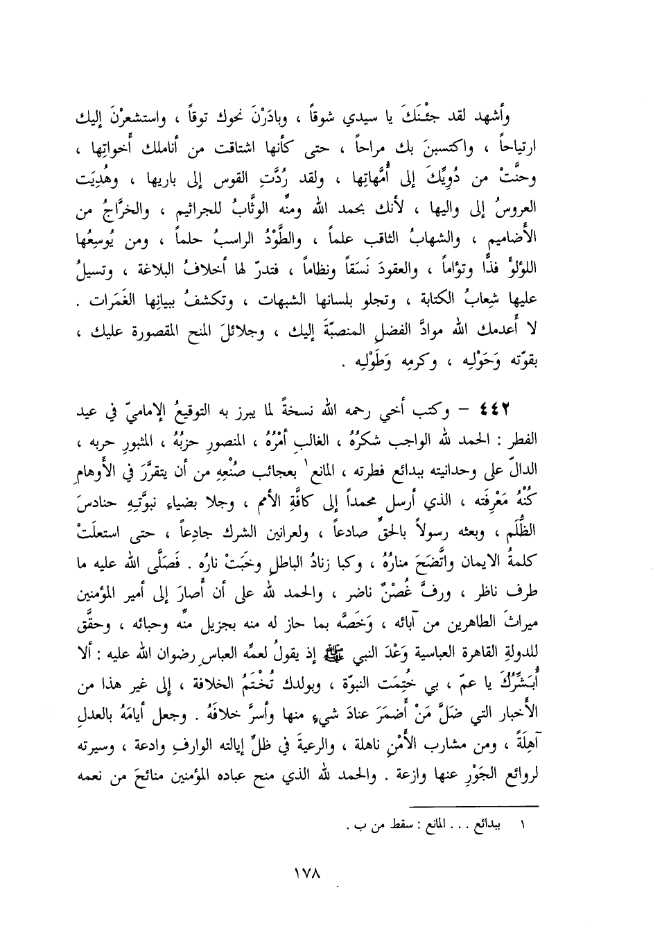 442- وكتب أخي رحمه الله نسخة لما يبرز به التوقيع الإماميّ في عيد الفطر: الحمد لله الواجب شكره، الغالب أمره، المنصور حزبه، المثبور حربه، الدالّ على وحدانيته ببدائع فطرته، المانع [1] بعجائب صنعه من أن يتقرّر في الأوهام كنه معرفته، الذي أرسل محمدا إلى كافّة الأمم، وجلا بضياء نبوّته حنادس الظّلم، وبعثه رسولا بالحقّ صادعا، ولعرانين الشرك جادعا، حتى استعلت كلمة الايمان واتّضح مناره، وكبا زناد الباطل وخبت ناره. فصلّى الله عليه ما طرف ناظر، ورفّ غصن ناضر، والحمد لله على أن أصار إلى أمير المؤمنين ميراث الطاهرين من آبائه، وخصّه بما حاز له منه بجزيل منّه وحبائه، وحقّق للدولة القاهرة العباسية وعد النبي صلّى الله عليه وسلم إذ يقول لعمّه العباس رضوان الله عليه: ألا أبشّرك يا عمّ، بي ختمت النبوّة، وبولدك تختم الخلافة، إلى غير هذا من الأخبار التي ضلّ من أضمر عناد شيء منها وأسرّ خلافه. وجعل أيامه بالعدل آهلة، ومن مشارب الأمن ناهلة، والرعية في ظلّ إيالته الوارف وادعة، وسيرته لروائع الجور عنها وازعة. والحمد لله الذي منح عباده المؤمنين منائح من نعمه