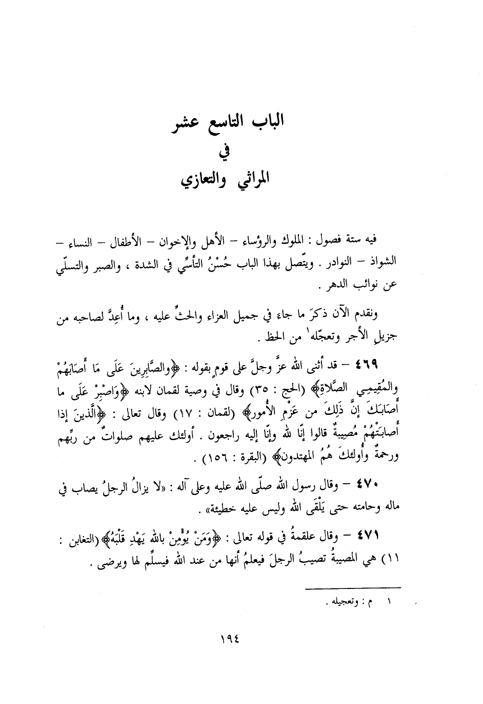 ونقدم الآن ذكر ما جاء في جميل العزاء والحثّ عليه، وما أعدّ لصاحبه من جزيل الأجر وتعجّله [1] من الحظ.