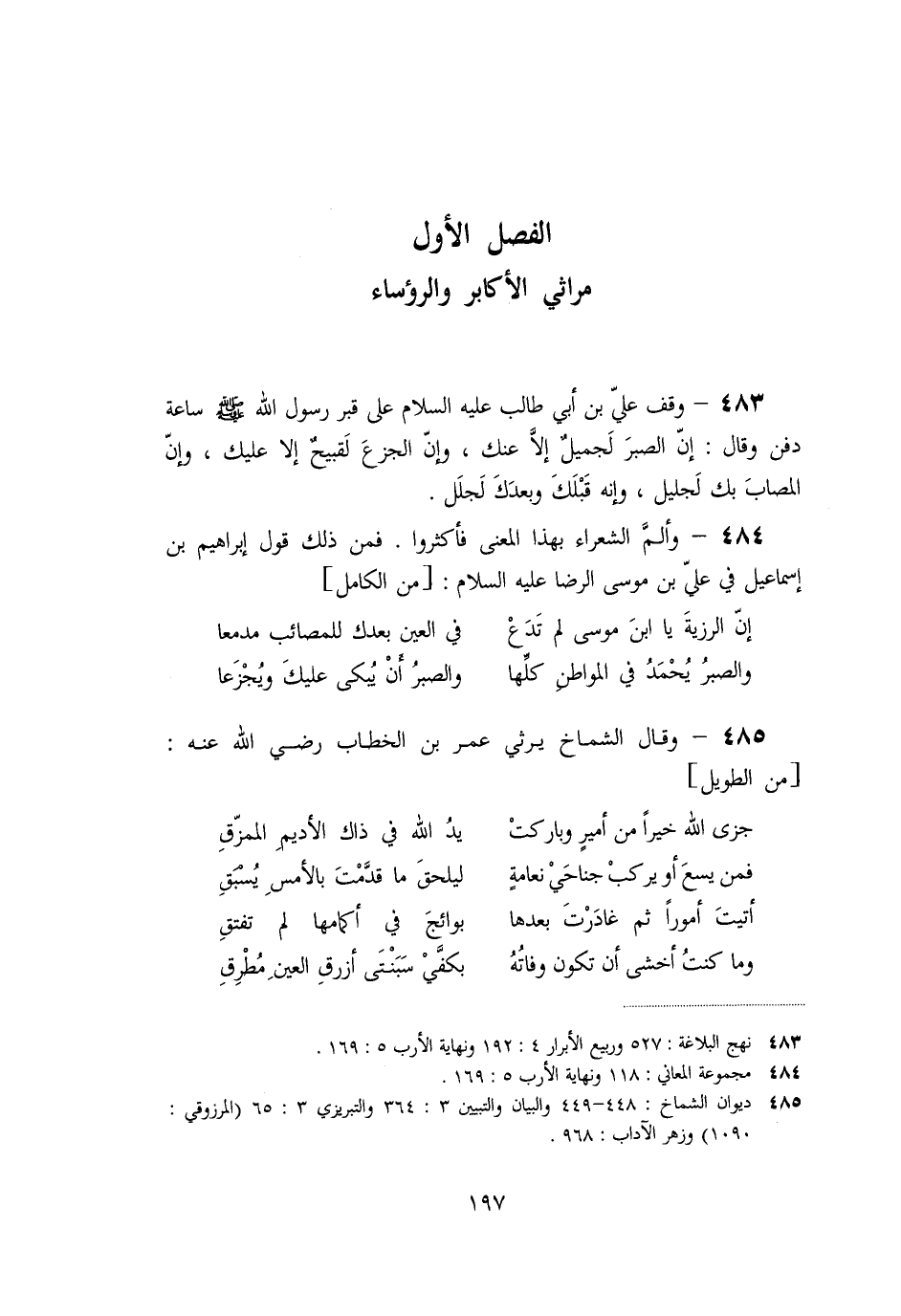 «483» - وقف عليّ بن أبي طالب عليه السلام على قبر رسول الله صلّى الله عليه وسلم ساعة دفن وقال: إنّ الصبر لجميل إلّا عنك، وإنّ الجزع لقبيح إلا عليك، وإنّ المصاب بك لجليل، وإنه قبلك وبعدك لجلل.
