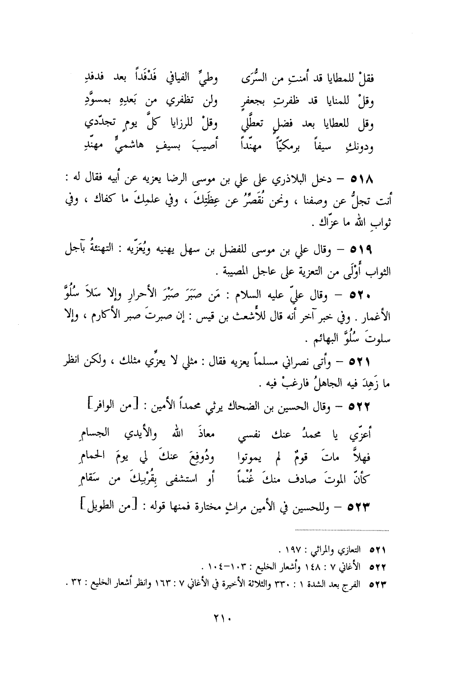 «523» - وللحسين في الأمين مراث مختارة فمنها قوله: [من الطويل]