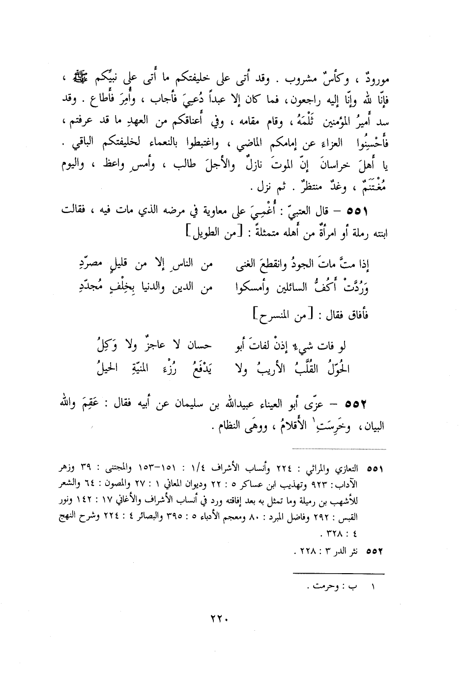 «551» - قال العتبيّ: أغمي على معاوية في مرضه الذي مات فيه، فقالت ابنته رملة أو امرأة من أهله متمثلة: [من الطويل]