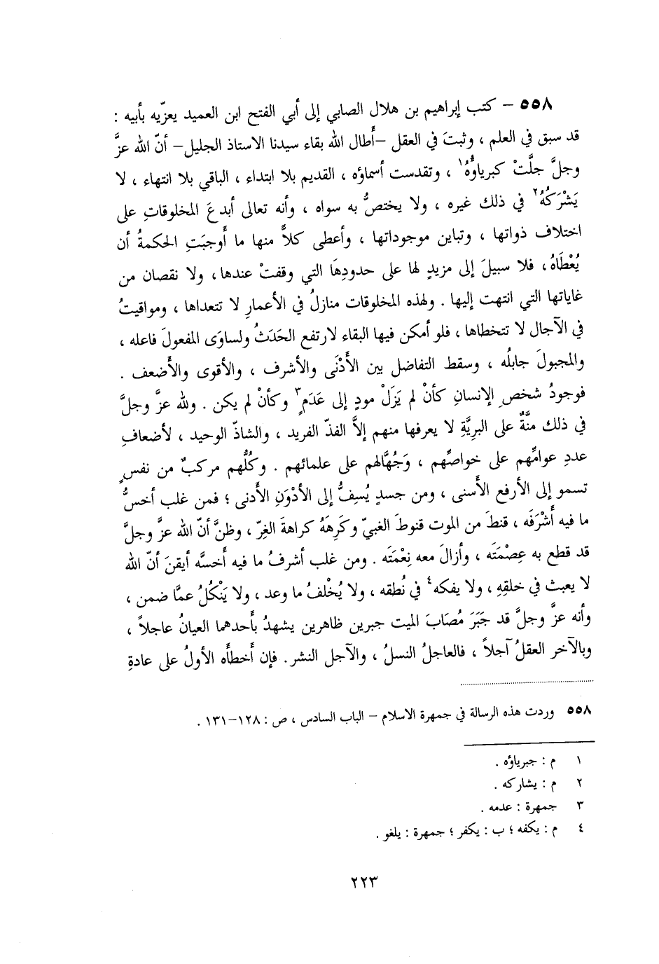 «558» - كتب إبراهيم بن هلال الصابي إلى أبي الفتح ابن العميد يعزّيه بأبيه: