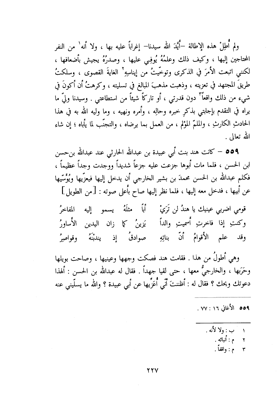 «559» - كانت هند بنت أبي عبيدة بن عبد الله الحارثي عند عبد الله بن حسن ابن الحسن، فلما مات أبوها جزعت عليه جزعا شديدا ووجدت وجدا عظيما، فكلم عبد الله بن الحسن محمّد بن بشير الخارجي أن يدخل إليها فيعزّيها ويؤسّيها عن أبيها، فدخل معه إليها، فلما نظر إليها صاح بأعلى صوته: [من الطويل]