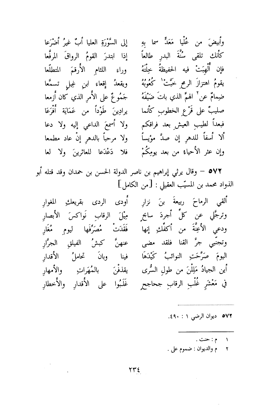 «572» - وقال يرثي إبراهيم بن ناصر الدولة الحسن بن حمدان وقد قتله أبو الذواد محمد بن المسيّب العقيلي: [من الكامل]