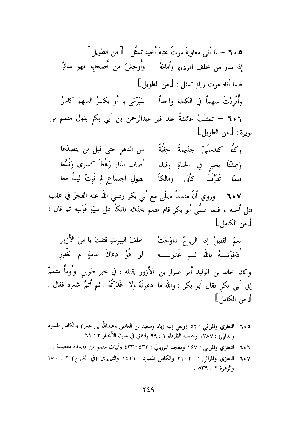 «607» - وروي أنّ متمما صلّى مع أبي بكر رضي الله عنه الفجر في عقب قتل أخيه، فلما صلّى أبو بكر قام متمم بحذائه فاتكأ على سية قوسه ثم قال: