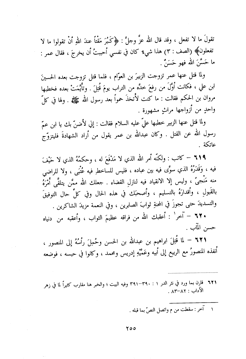 619- كاتب: ولكنّه أمر الله الذي لا مدفع له، وحكمه الذي لا حيف فيه، وقدره الذي سوّى فيه بين عباده، فليس للساخط فيه عتبى، ولا للراضي منه منجى، وليس إلا الانقياد فيه لنازل القضاء. جعلك الله ممّن يتلقّى أمره بالقبول، وأقداره بالتسليم، وأصحبك في هذه الحال وفي كلّ حال التوفيق والتسديد حتى تجوز في المحنة ثواب الصابرين، وفي النعمة مزيد الشاكرين.