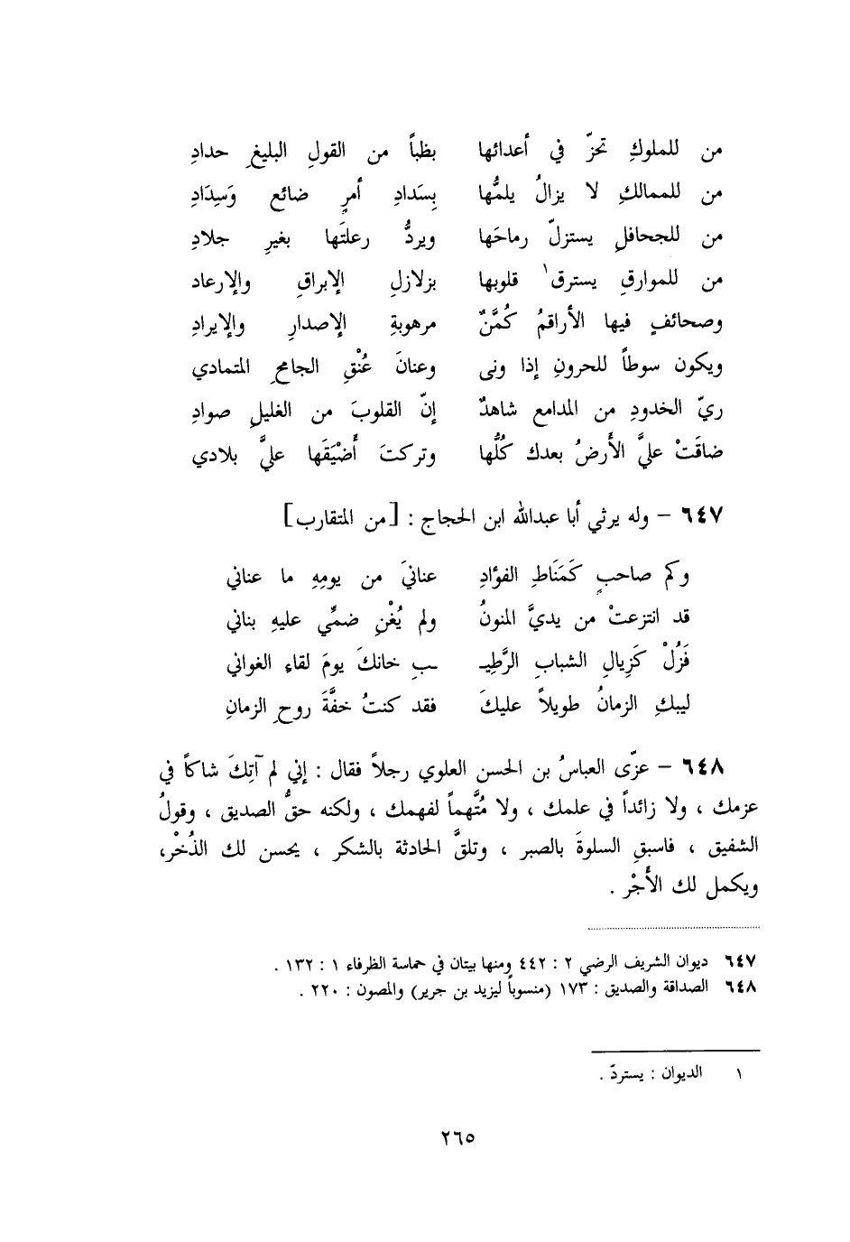 «648» - عزّى العباس بن الحسن العلوي رجلا فقال: إني لم آتك شاكا في عزمك، ولا زائدا في علمك، ولا متّهما لفهمك، ولكنه حقّ الصديق، وقول الشفيق، فاسبق السلوة بالصبر، وتلقّ الحادثة بالشكر، يحسن لك الذخر، ويكمل لك الأجر.