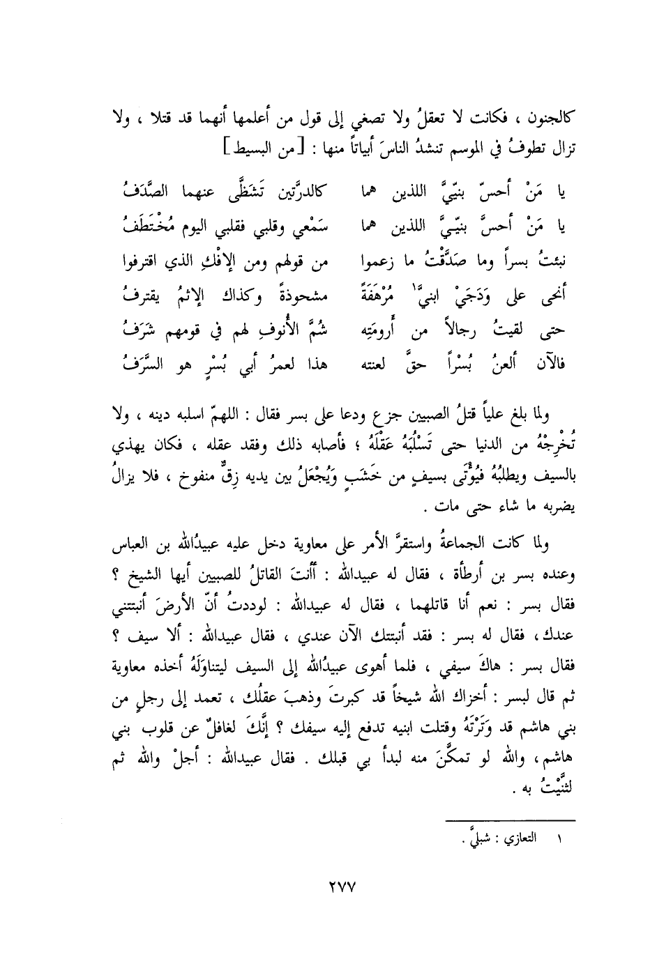 فقال بسر: نعم أنا قاتلهما، فقال له عبيد الله: لوددت أنّ الأرض أنبتتني عندك، فقال له بسر: فقد أنبتتك الآن عندي، فقال عبيد الله: ألا سيف؟