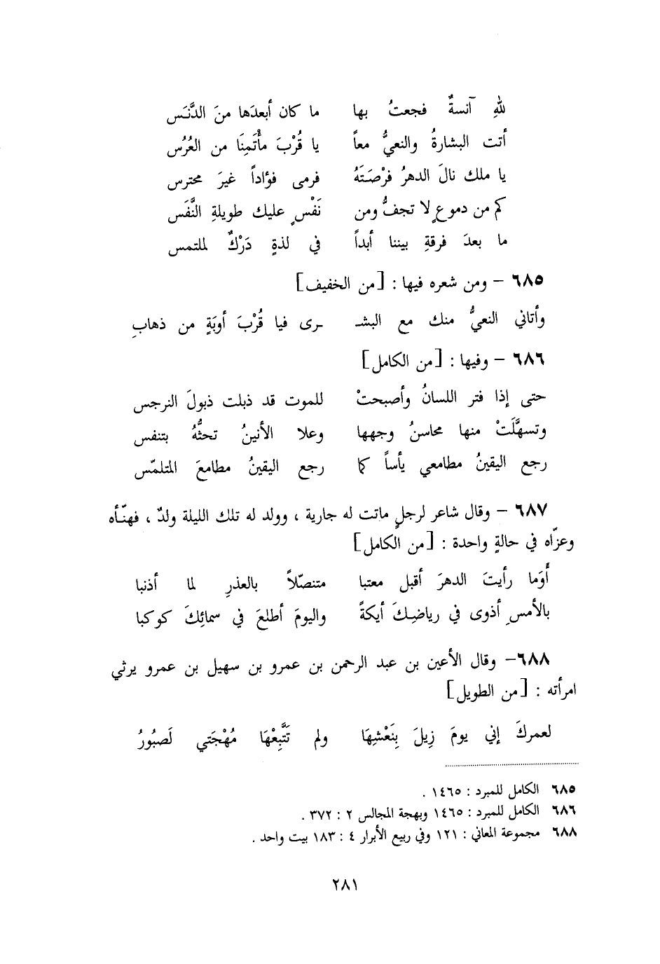 «688» - وقال الأعين بن عبد الرحمن بن عمرو بن سهيل بن عمرو يرثي امرأته: [من الطويل]