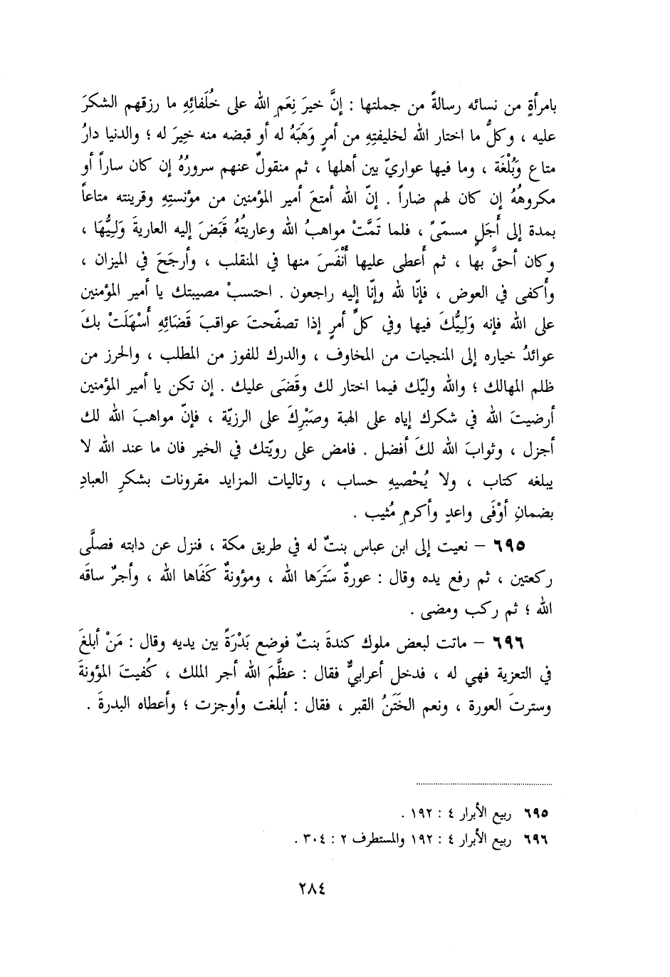 «695» - نعيت إلى ابن عباس بنت له في طريق مكة، فنزل عن دابته فصلّى ركعتين، ثم رفع يده وقال: عورة سترها الله، ومؤونة كفاها الله، وأجر ساقه الله؛ ثم ركب ومضى.